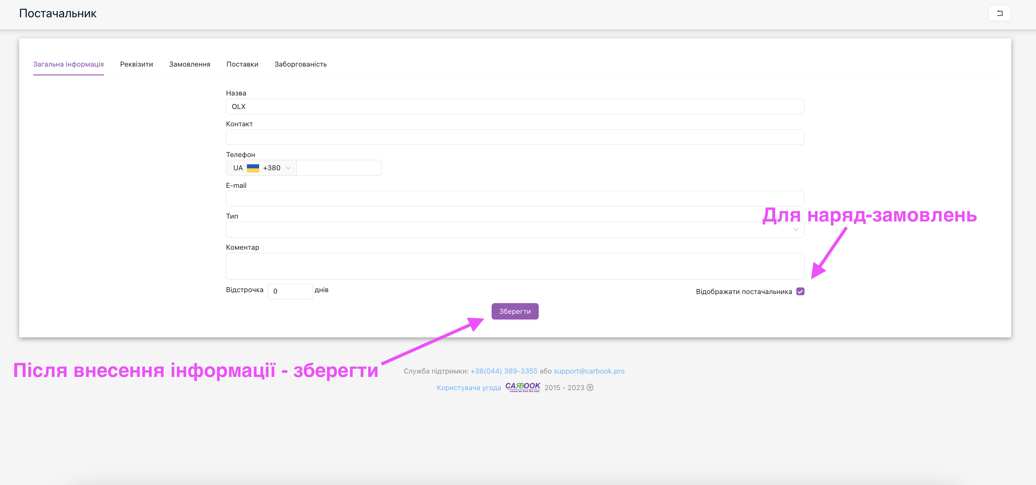 Та натискаємо “Зберегти“. Тепер постачальник доданий до списку постачальників, його можна знайти переглянувши список або скористатись полем пошуку зверху списку. Віднайшовши його, натискаємо на ньому для додаткових налаштувань. Кнопка “Відображати постачальника” зроблена для того, щоб при оформленні субпідряду в наряд-замовленні, постачальник був в списку “Постачальників” які можуть виконувати роботи як субпідряд.