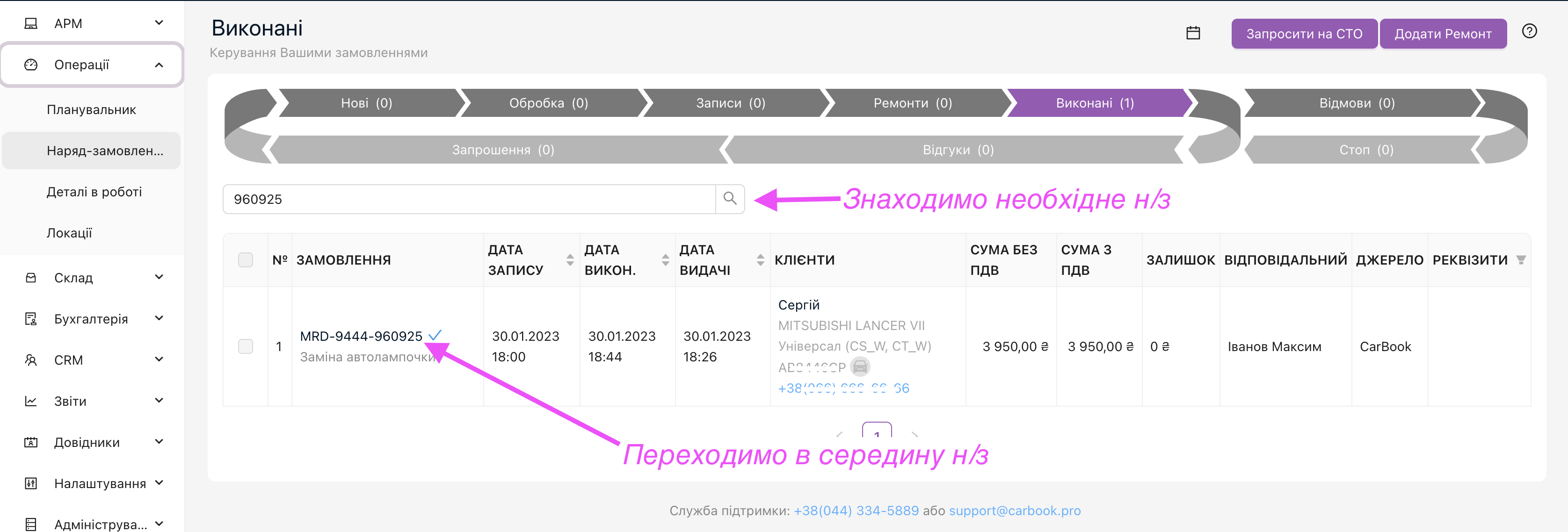 Таким чином, ми “розпровели” наряд-замовлення та внесли зміни в нього, а саме додали “механіка” та “запчастиста” та додали ще одну деталь, до наряд-замовлення на прохання клієнта. Потім успішно завершили та сплатили це наряд-замовлення й отримали відповідні документи в касі, а також в складському обліку.