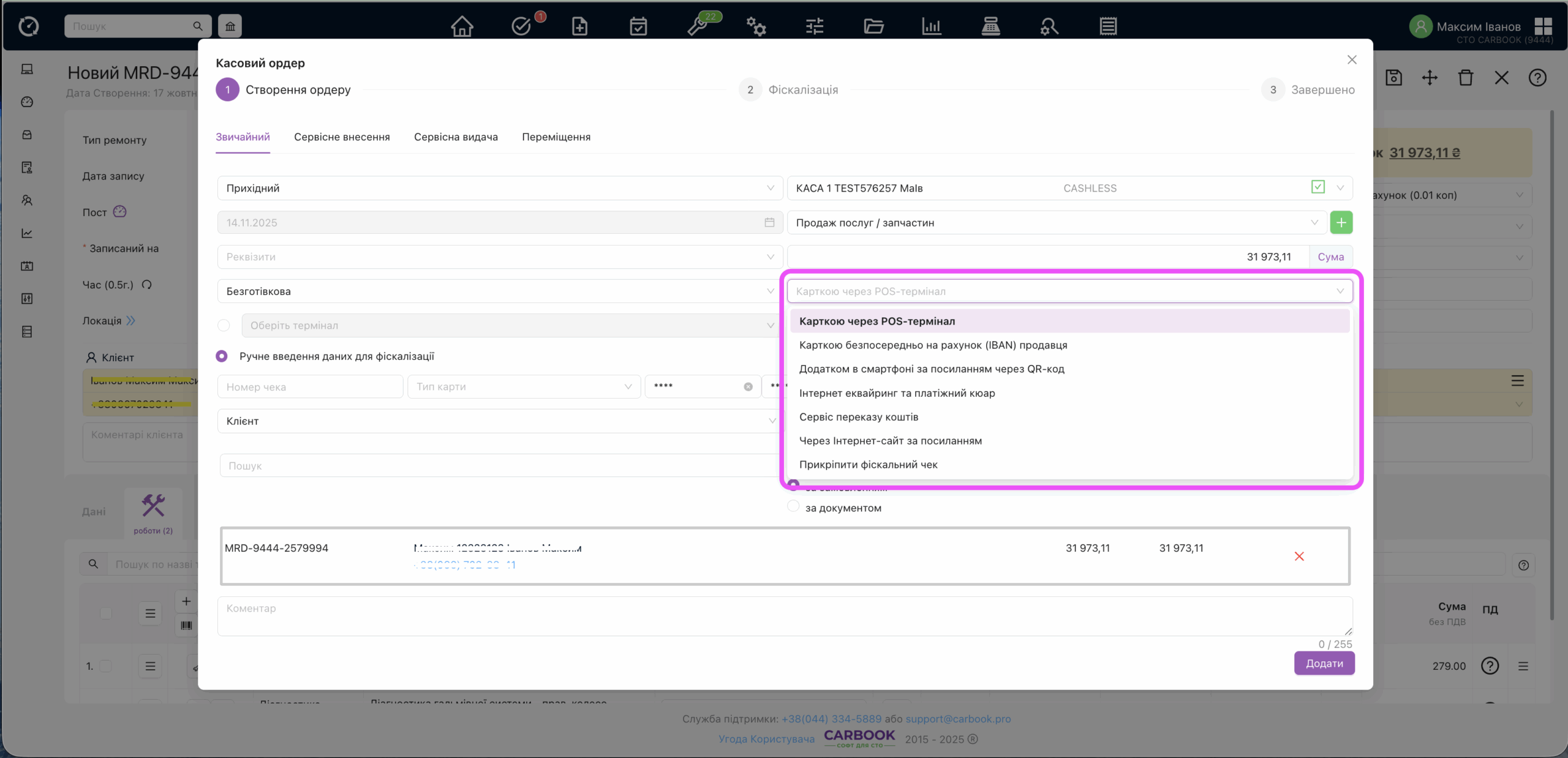 • Прикріпити фіскальний чек (Працює тільки для checkbox.ua) ⮕ До замовлення можна прикріпити фіскальний чек створений через кабінет checkbox.ua, а не через CARBOOK. При обраному типі каси “безготівка” та активації в селекті способу оплати обрати “Прикріпити фіскальний чек”, будуть доступні  фіскальні чеки, створені сьогодні та відсортовані, спочатку найновіші. Прикріплений чек до замовлення, в системі буде відображатись, як звичайний фіскальний чек, але без повторної фіскалізації.