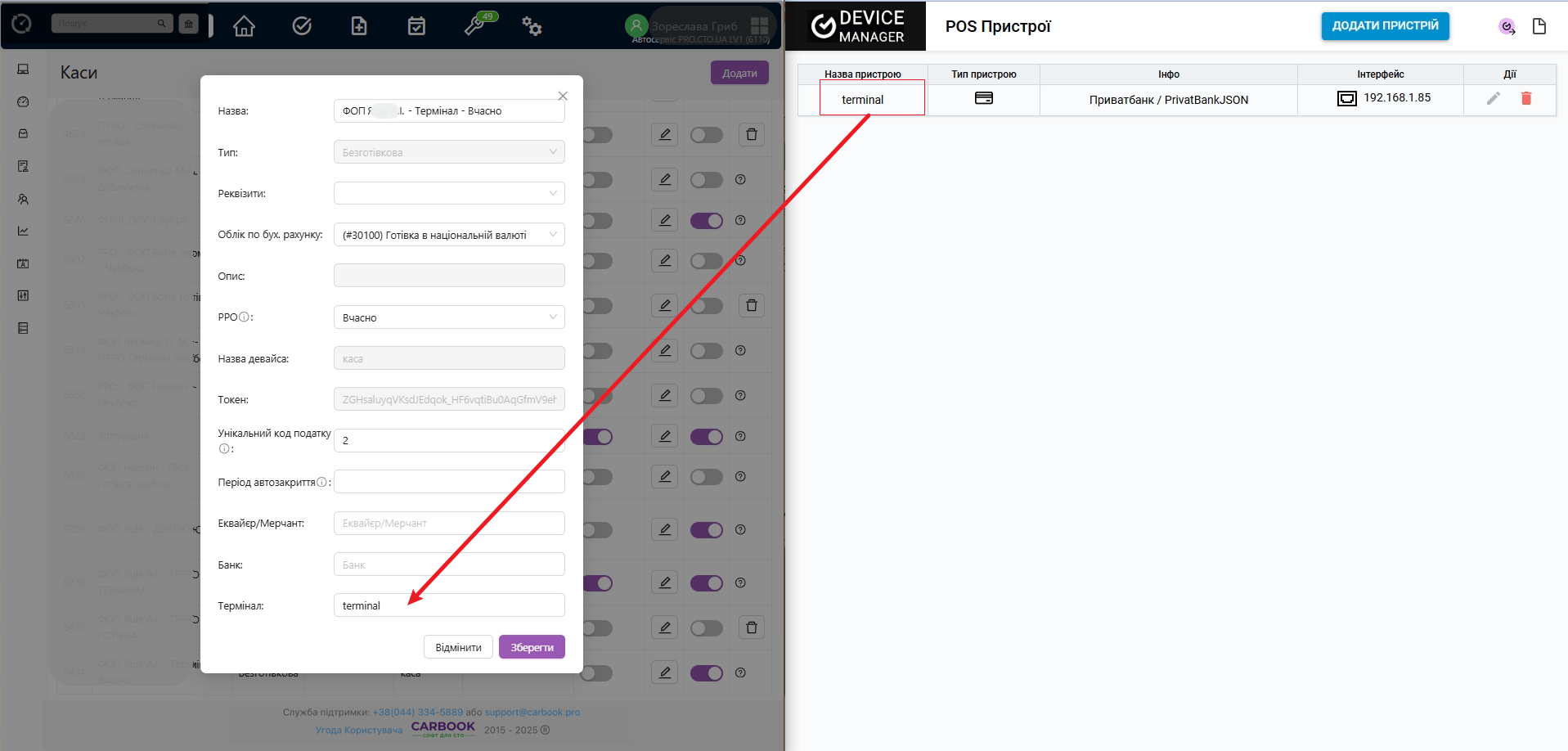 • Запишіть точну назву каси та пристрою так, як ви їх вказали під час створення. На прикладі вище, CARBOOK-TER та CARBOOK-PRO.