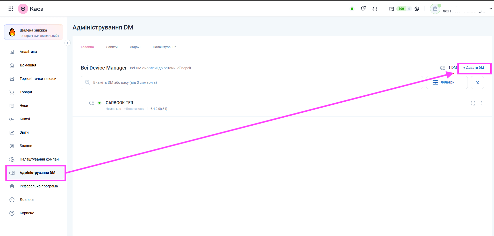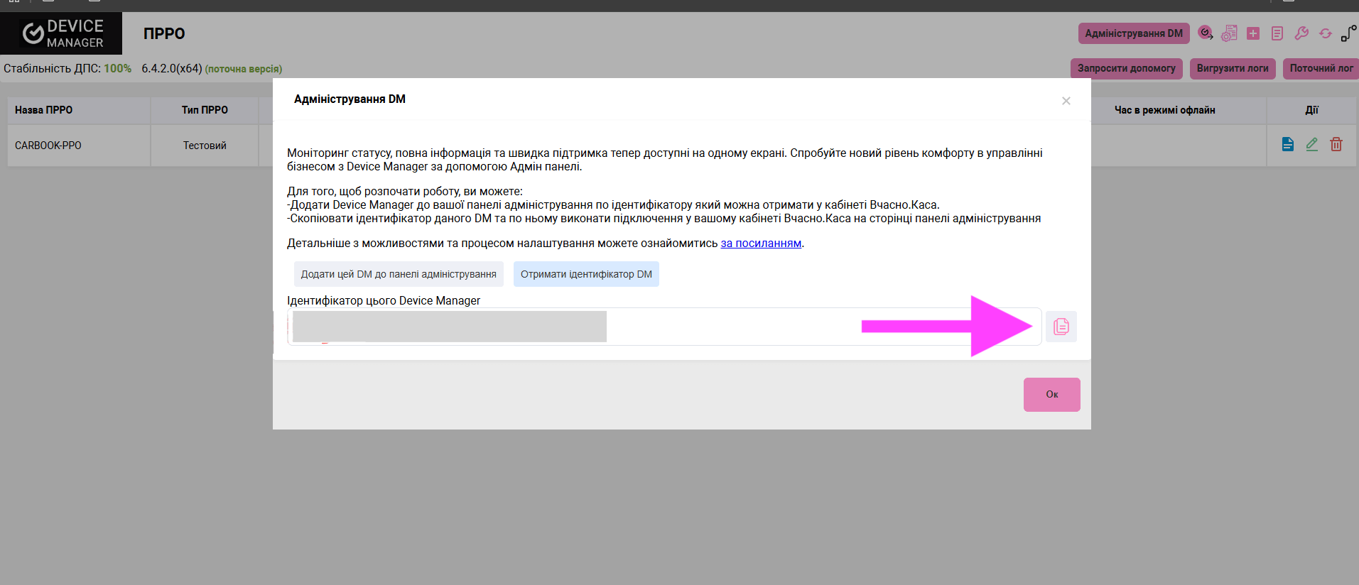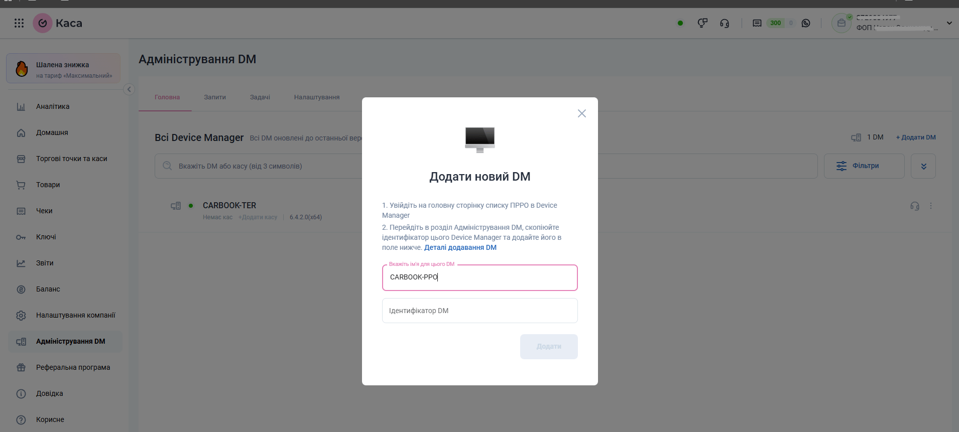 5. Далі додаємо DM. Це імʼя потім знадобиться для налаштування каси в CARBOOK. Нижче показано, звідки взяти ідентифікатор. Отримуємо його натискаючи на кнопку Адміністрування ДМ в девайс менеджері -> Отримати ідентифікатор DM -> копіюємо цей ідентифікатор і вставляємоВікно додавання DM в кабінеті Вчасно.Каса
