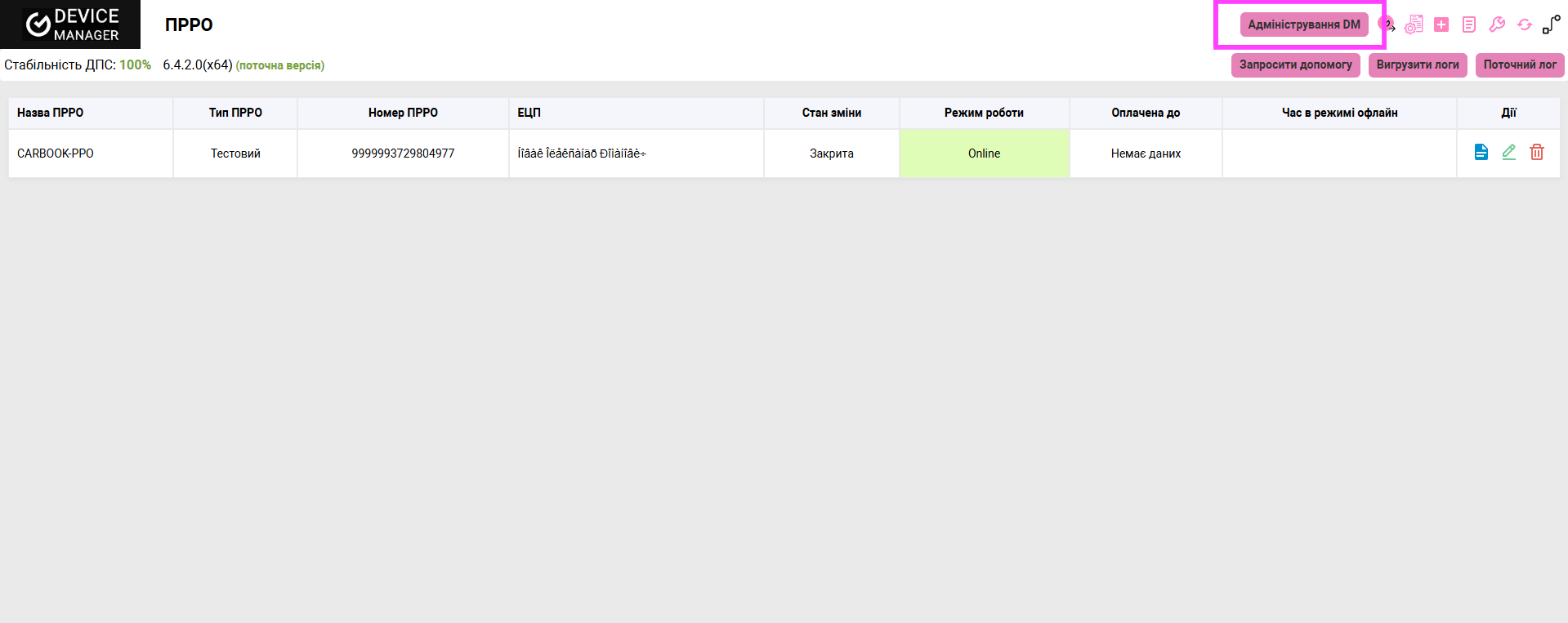 6. Ідентифікатор DM береться в застосунку Device Manager. Для перевірки звʼязку з терміналом, можна натиснути іконку в правому верхньому куті.Застосунок Device Manager