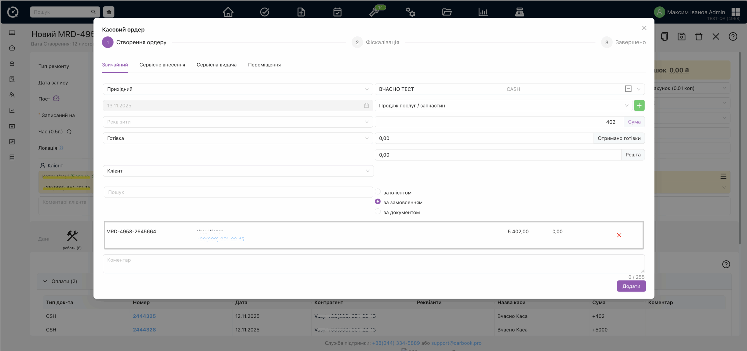 • Для проведення оплати через готівку, необхідно обрати касу, обрати спосіб оплати, внести суму отриману від клієнта і заповнивши всі інші необхідні поля натиснути на гаразд. Чек від ПРРО буде містити в собі дані про оплату та решту, яку ви надали клієнту. Після натискання на “гаразд” – буде відкрито наступний крок, в якому автоматично буде створено касовий ордер та буде проводитись фіскалізація через ПРРО, в разу успіху, модальне вікно буде закрите та завантажено чек. Модальне вікно створення/редагування касового ордера.