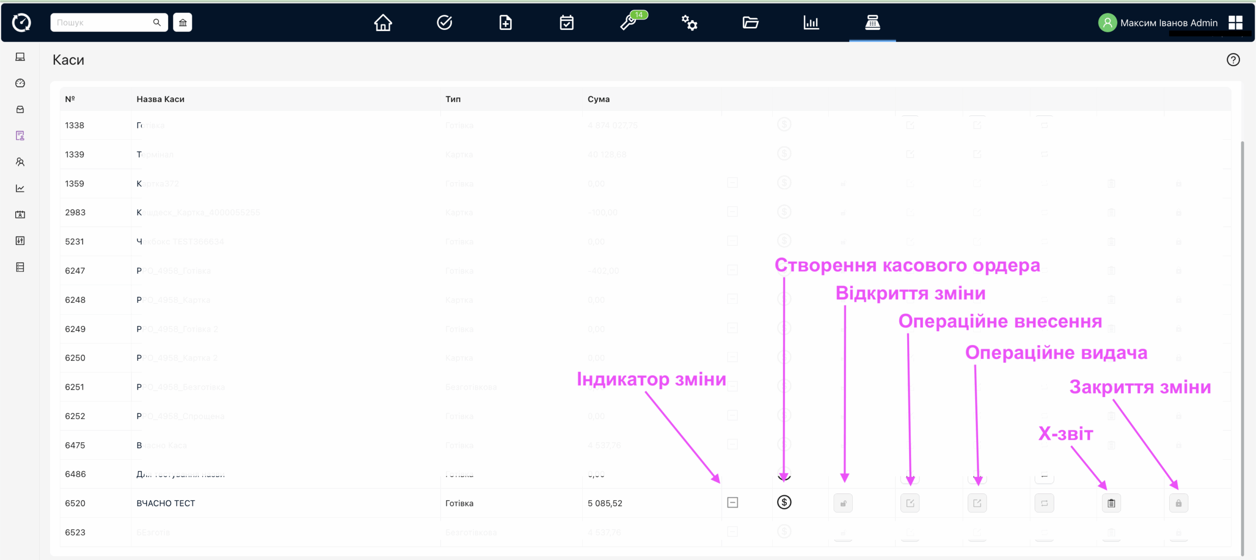 • Спочатку відкрити зміну, якщо цього не було зроблено. На скріні вище показано, як це зробити. Після відкриття зміни індикатор має бути зеленим. Далі можна з будь-якого місця клікнути іконку з доларом та побачити відкриття модального вікна для сторення/редагування касового ордера.