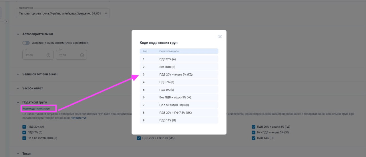 • Унікальний код податку – прописати за потреби, взяти з налаштувань каси – в кабінеті Вчасно.Каса – розділ “Податкові групи”.Кабінет ВчасноКаса - налаштування кодів податкових ставок