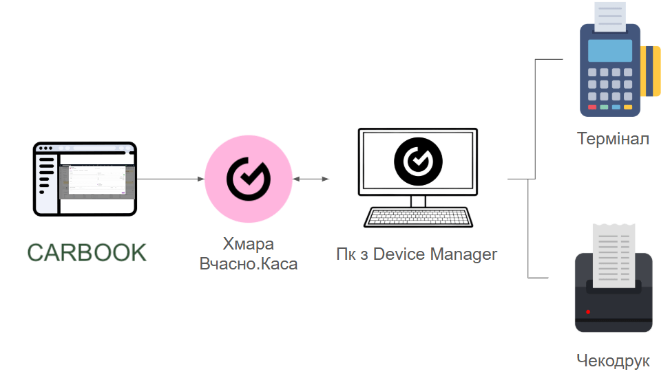 В даному випадку API запит відправляється з CARBOOK, наприклад на фіскалізацію чеку, на сервер Вчасно.Каса який тримає постійне підключення з ДМ (Device Manager) та може ним керувати. З серверу запит передається на ДМ який в свою чергу виконує оплату на терміналі (якщо в чеку оплата картою), фіскалізацію чеку та його друк як описано вище.