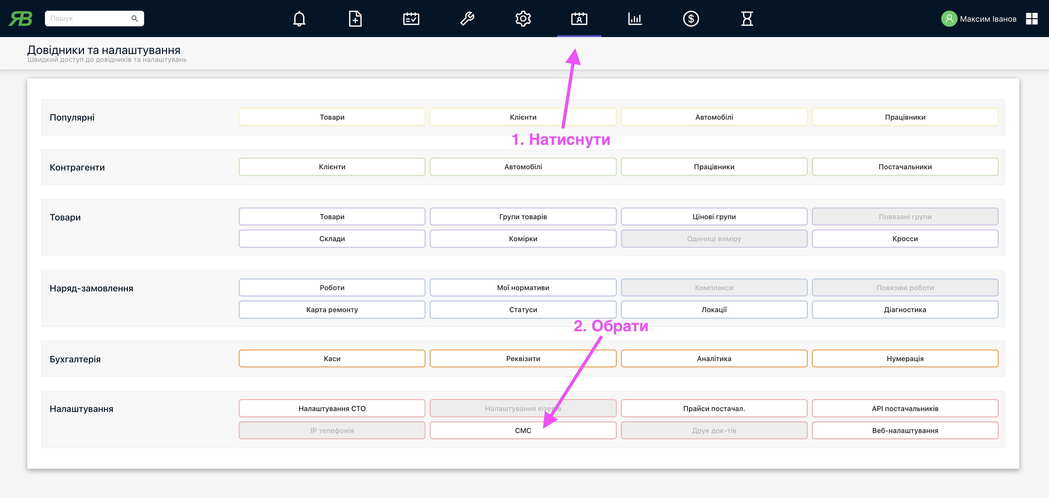 Два варіанти як потрапити в налаштування. Перший, через “Довідники та налаштування” потім обрати “СМС” знизу екрану.
