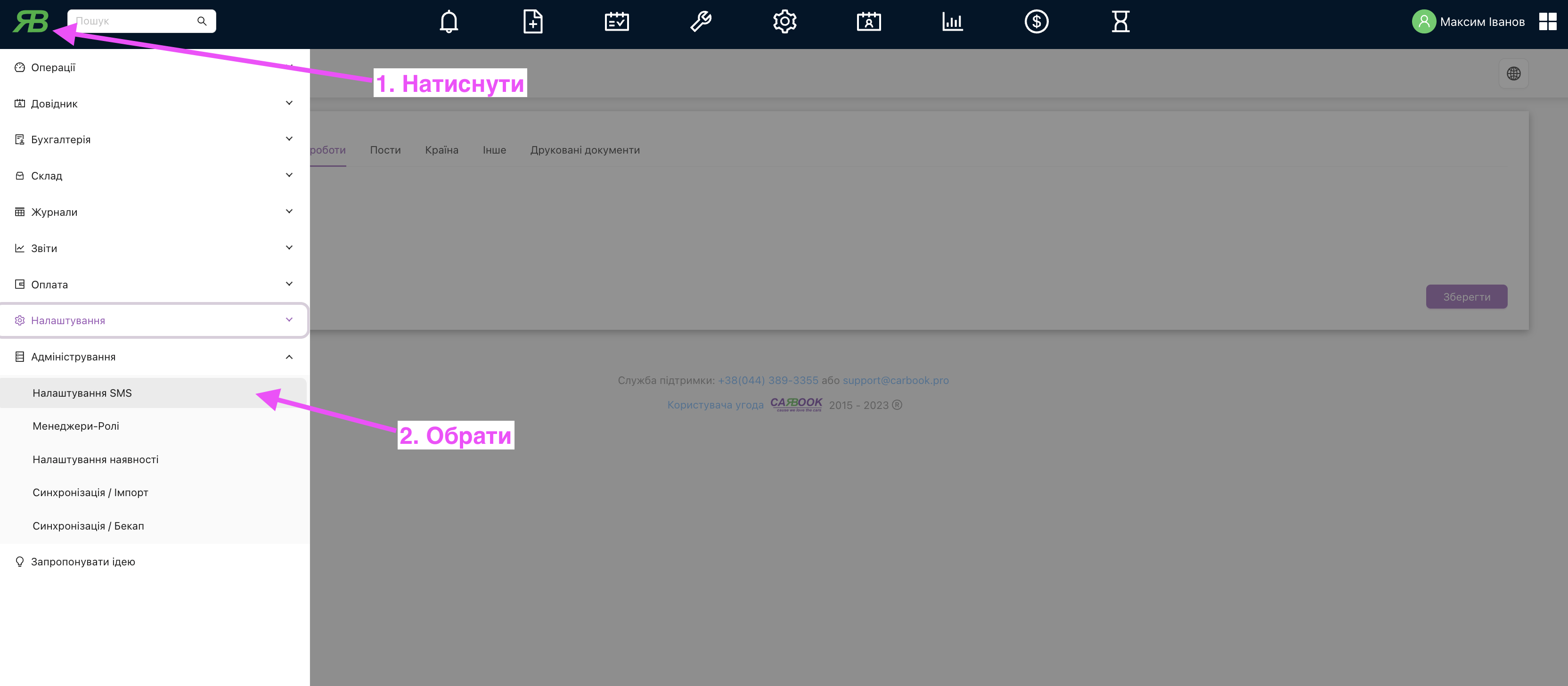 Другий варіант доступу, через бокове меню, перейшовши в “Адміністрування“, потім “Налаштування sms“.
