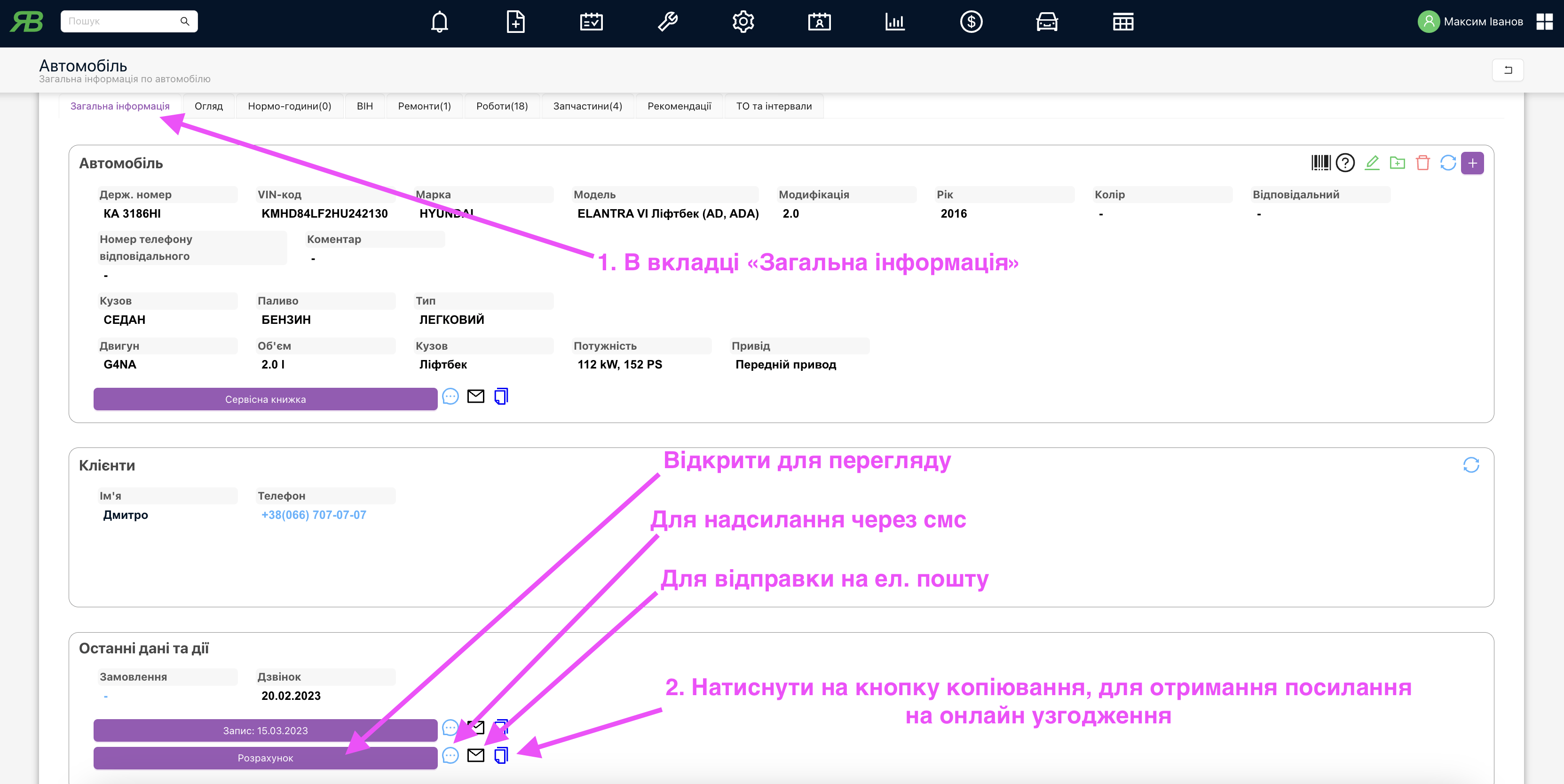 Коли додані роботи та запчастини, можемо відправляти узгодження натиснувши на кнопку “Відправити калькуляцію на узгодження”. Якщо налаштовані, смс у вашому акаунті, то клієнт отримує повідомлення на телефон. Але якщо треба відправити посилання через пошту чи месенджери? В такому разі, треба перейти в картку клієнта, для того, щоб скопіювати саме посилання або в картку авто, і скопіювати посилання кнопкою “Розрахунок”.