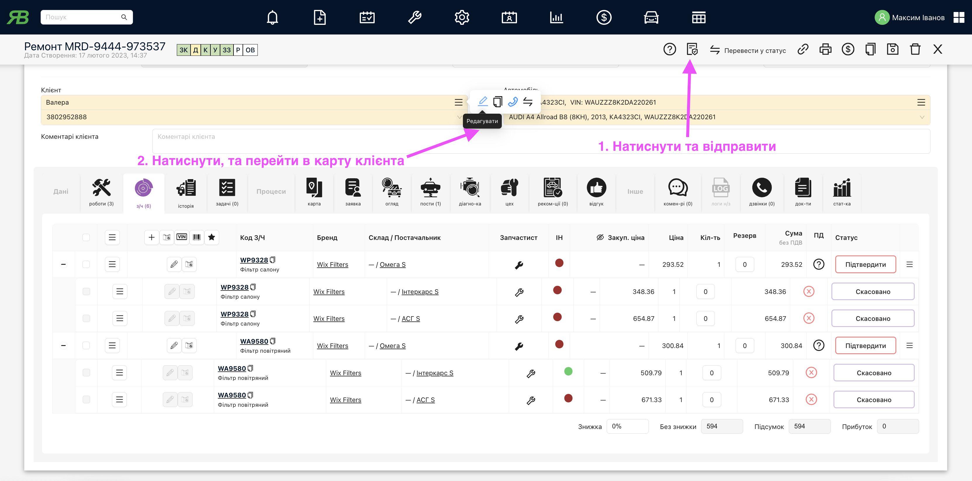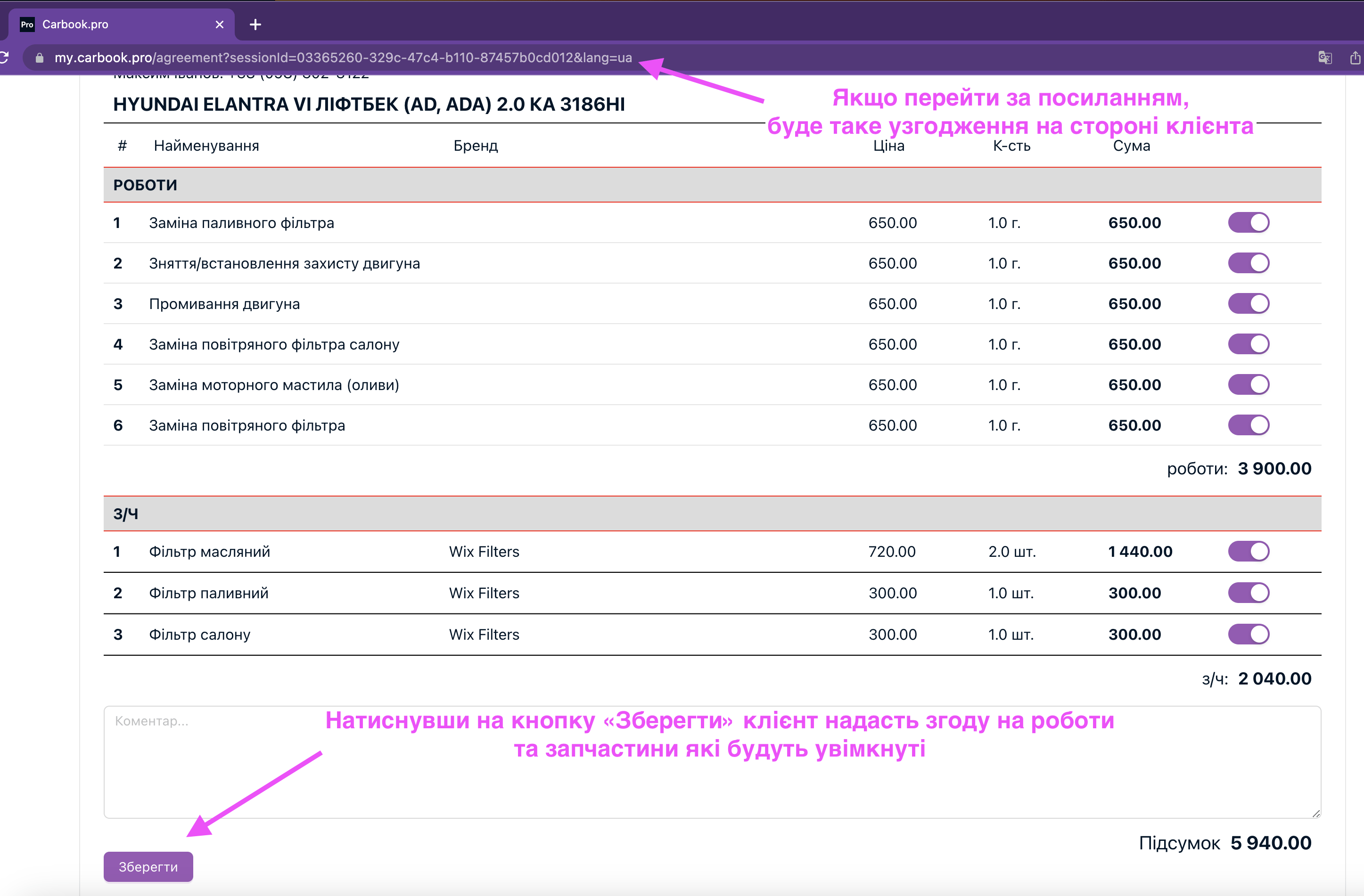 Таким чином, можна альтернативно відправити посилання клієнту для узгодження робіт чи запчастин.