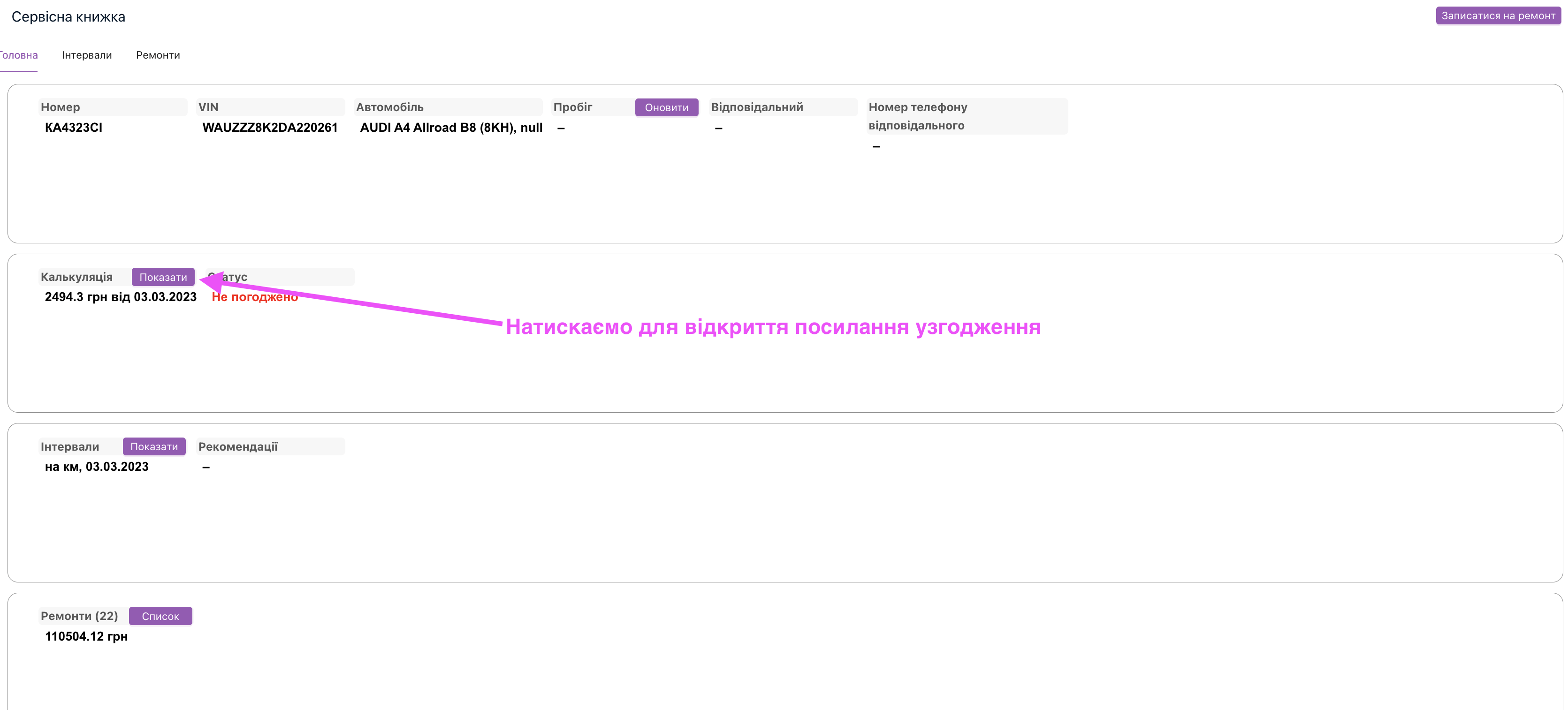 У відкритому вікні “Сервісної книжки” знаходимо потрібну нам калькуляцію, та натискаємо кнопку “Показати“. У новому вікні відкриється узгодження, можемо копіювати адресу цього посилання та надсилати клієнту.