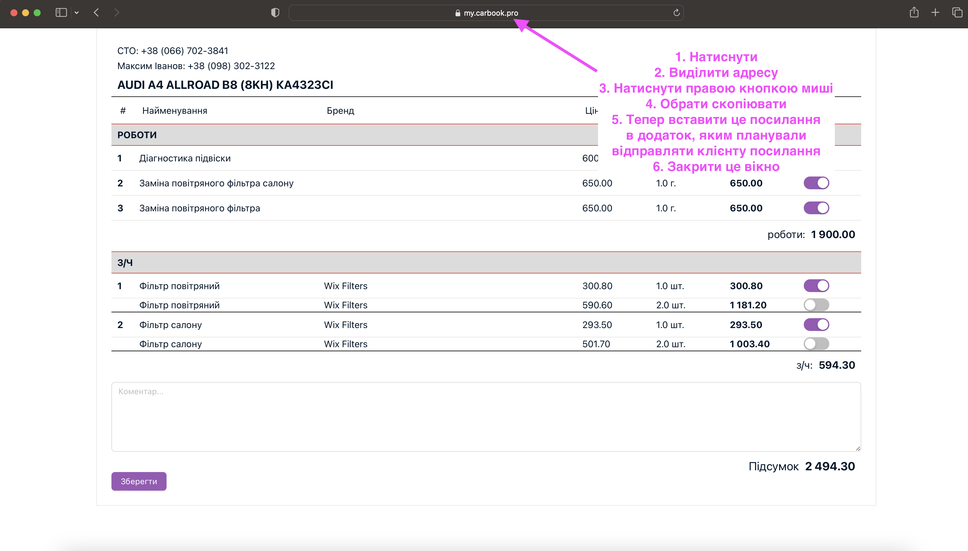 Тепер в новому вікні відкрилось вікно узгодження, де треба буде скопіювати посилання з рядка браузера і відправляти його клієнту, через зручний для нас спосіб. Для розділу “Роботи” та “Запчастини” буде розрахована знижка та виведена для клієнта.