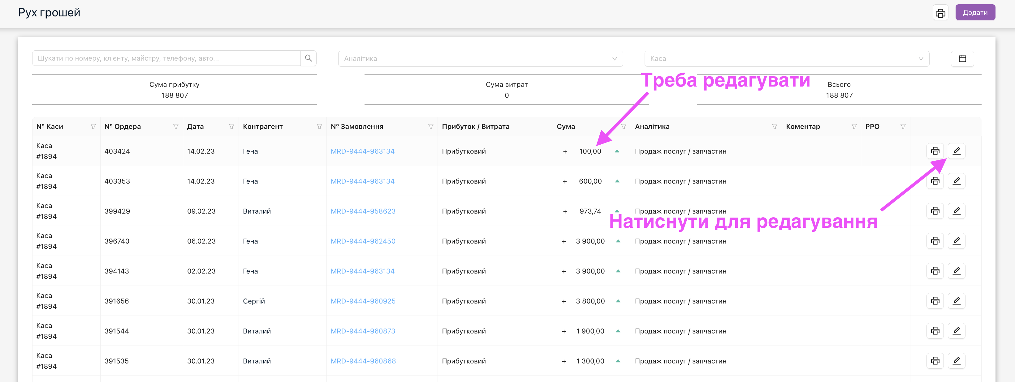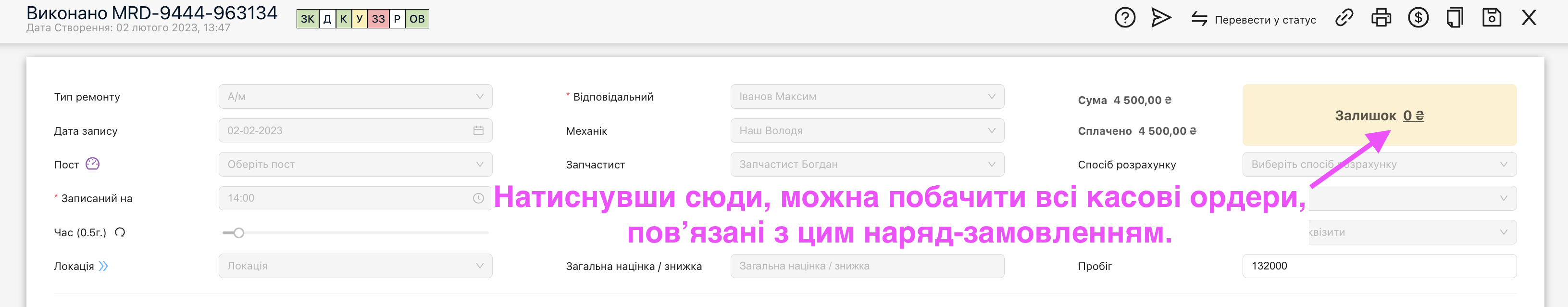 Перейти в вікно касових ордерів які повʼязані з наряд-замовленням, можна також і через натискання кнопки суми “Залишок” в самому наряд-замовлені.