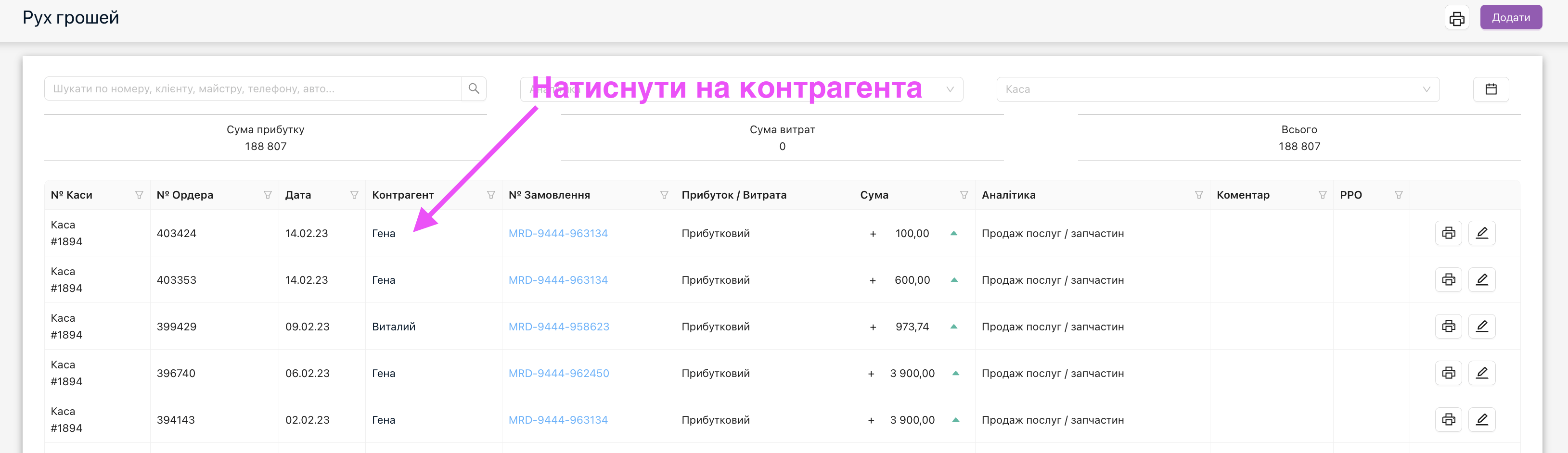 Повертаємось в “Рух грошей” та натискаємо на контрагента.
