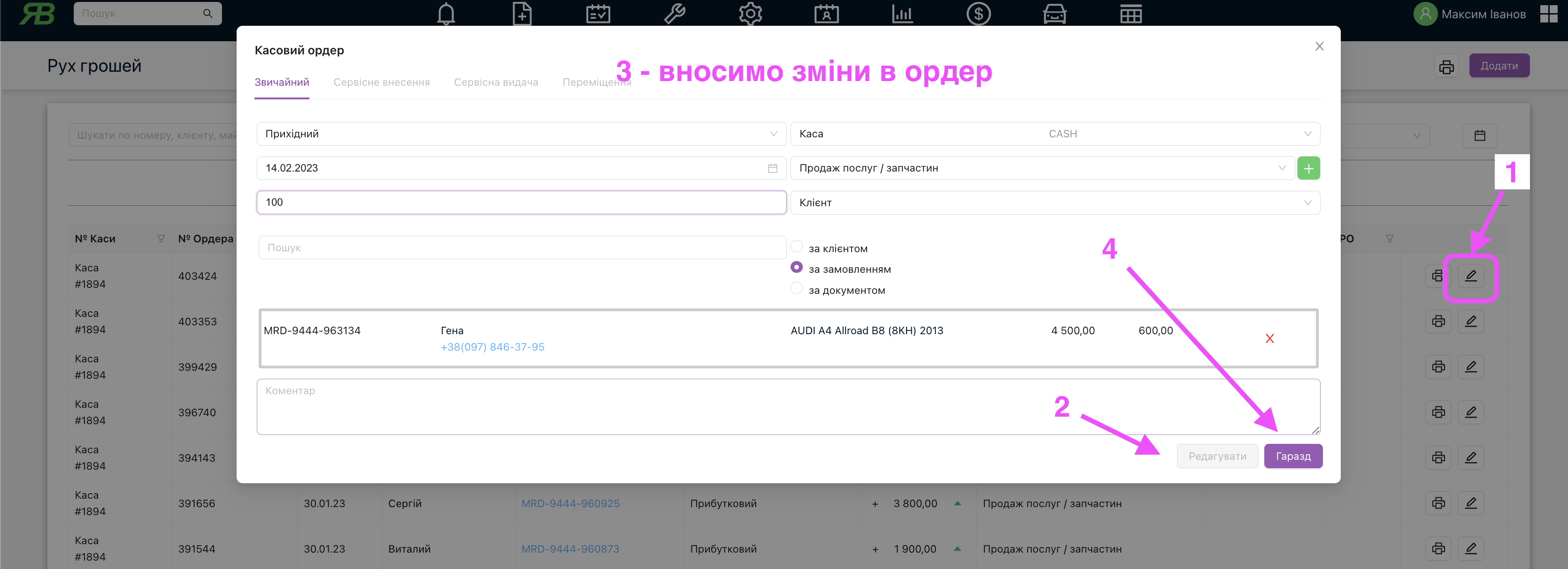 Тепер є можливість внести зміни в касовий ордер та зберегти його. В “Рух грошей” буде тепер виправлений документ.