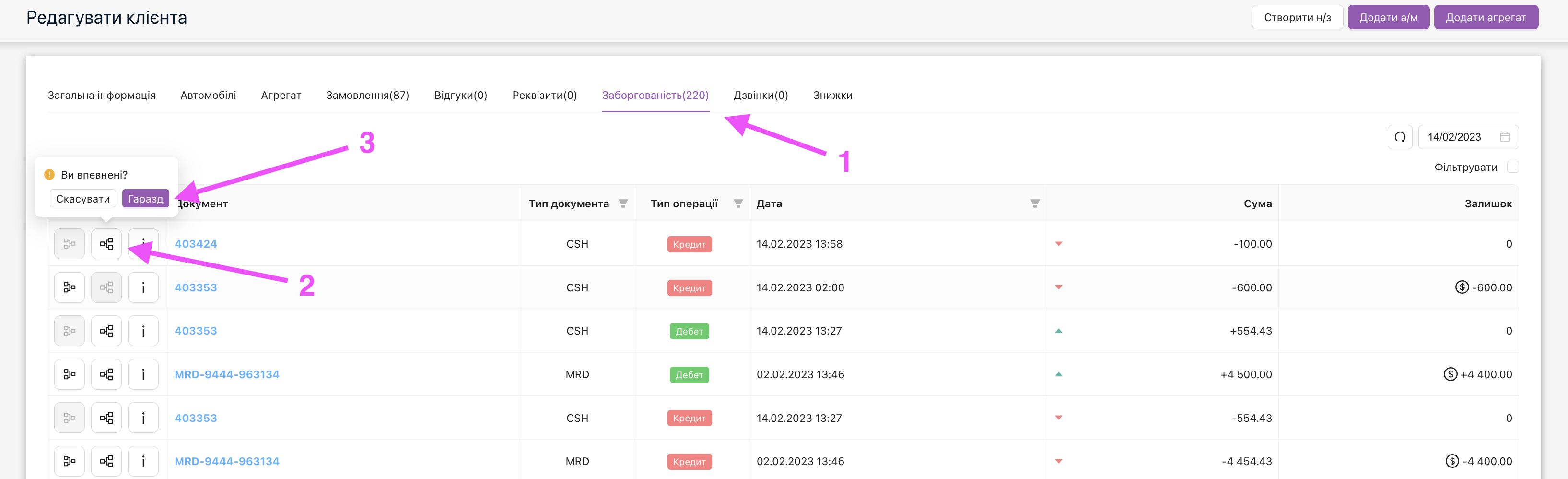 Далі ми потрапляємо в картку клієнта і далі нам треба перейти в вкладку “Заборгованість” та “розпарувати” потрібний документ.