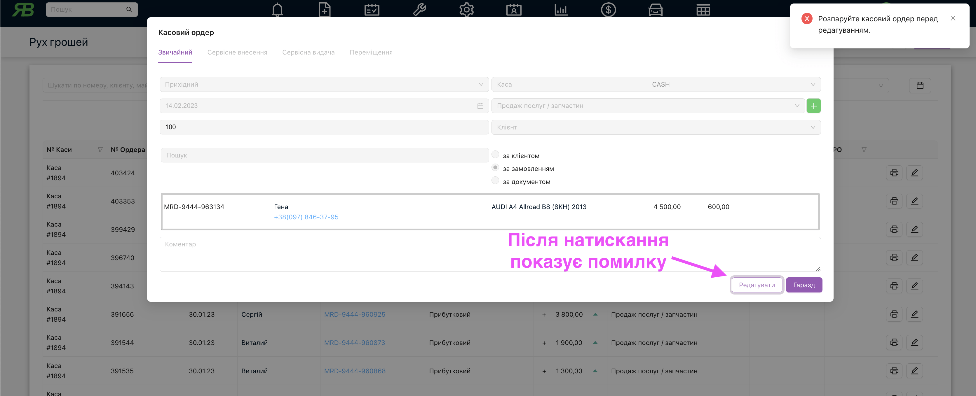 Після натискання відкривається вікно для редагування касового ордера. Для редагування треба натиснути кнопку “Редагувати“. Якщо показує таку помилку як на малюнку, то треба знайти касовий ордер та розпарувати його, для внесення змін.