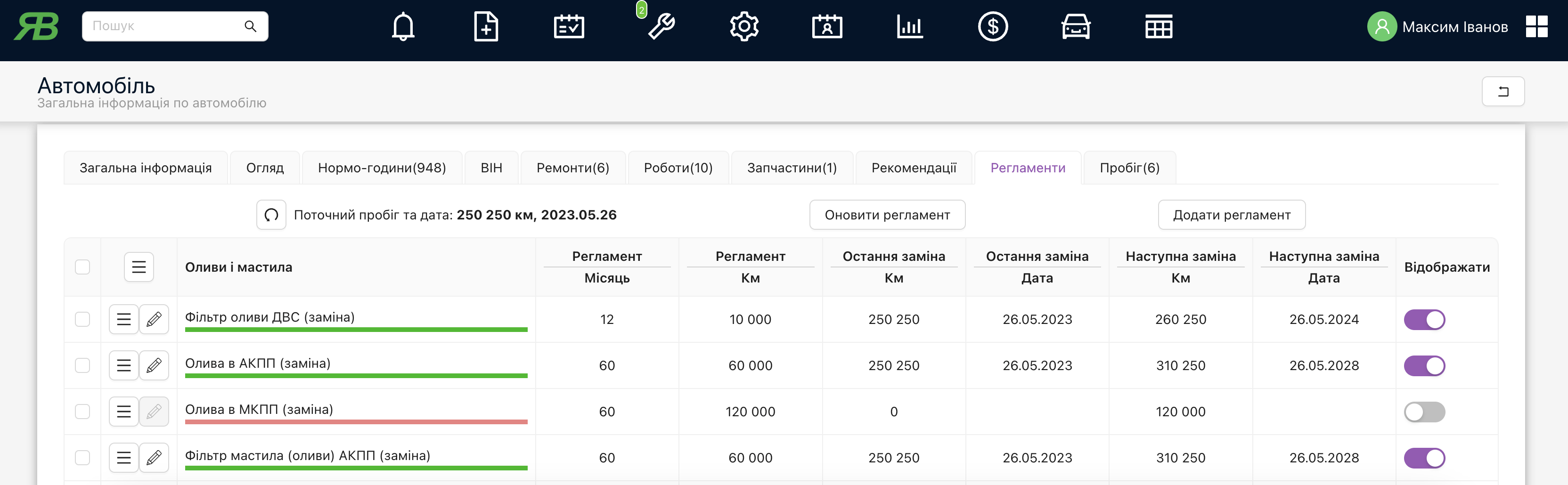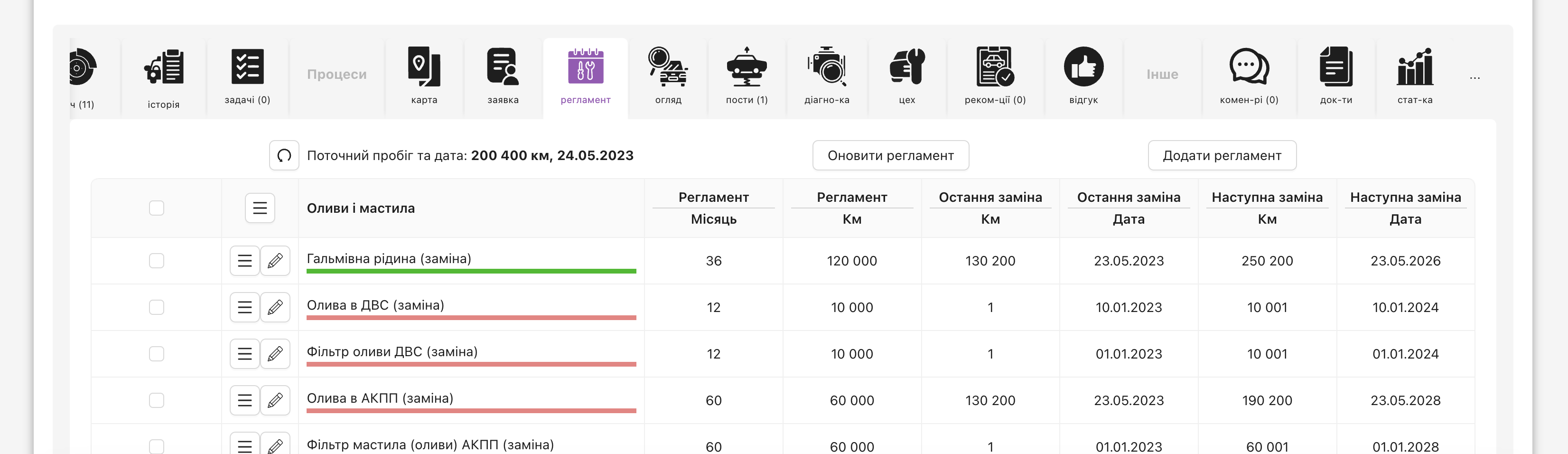 Регламент обслуговування, допомагає планувати ремонт та полегшує надання рекомендацій для автомобіля клієнта. Виглядає це наступним чином.