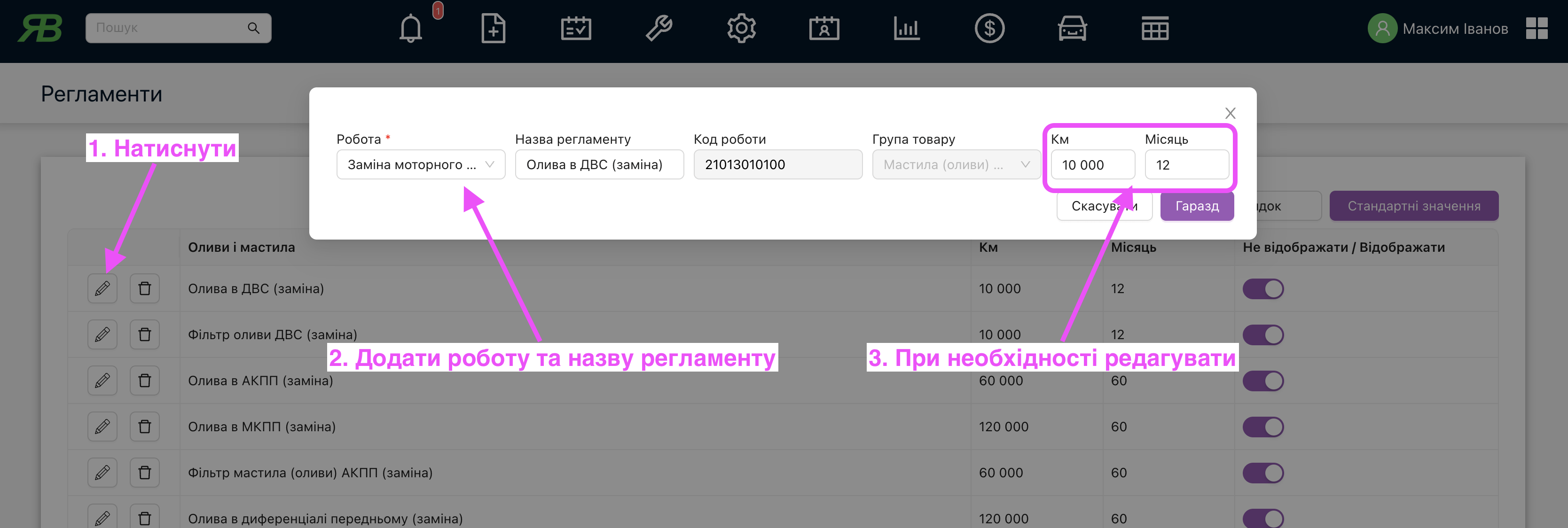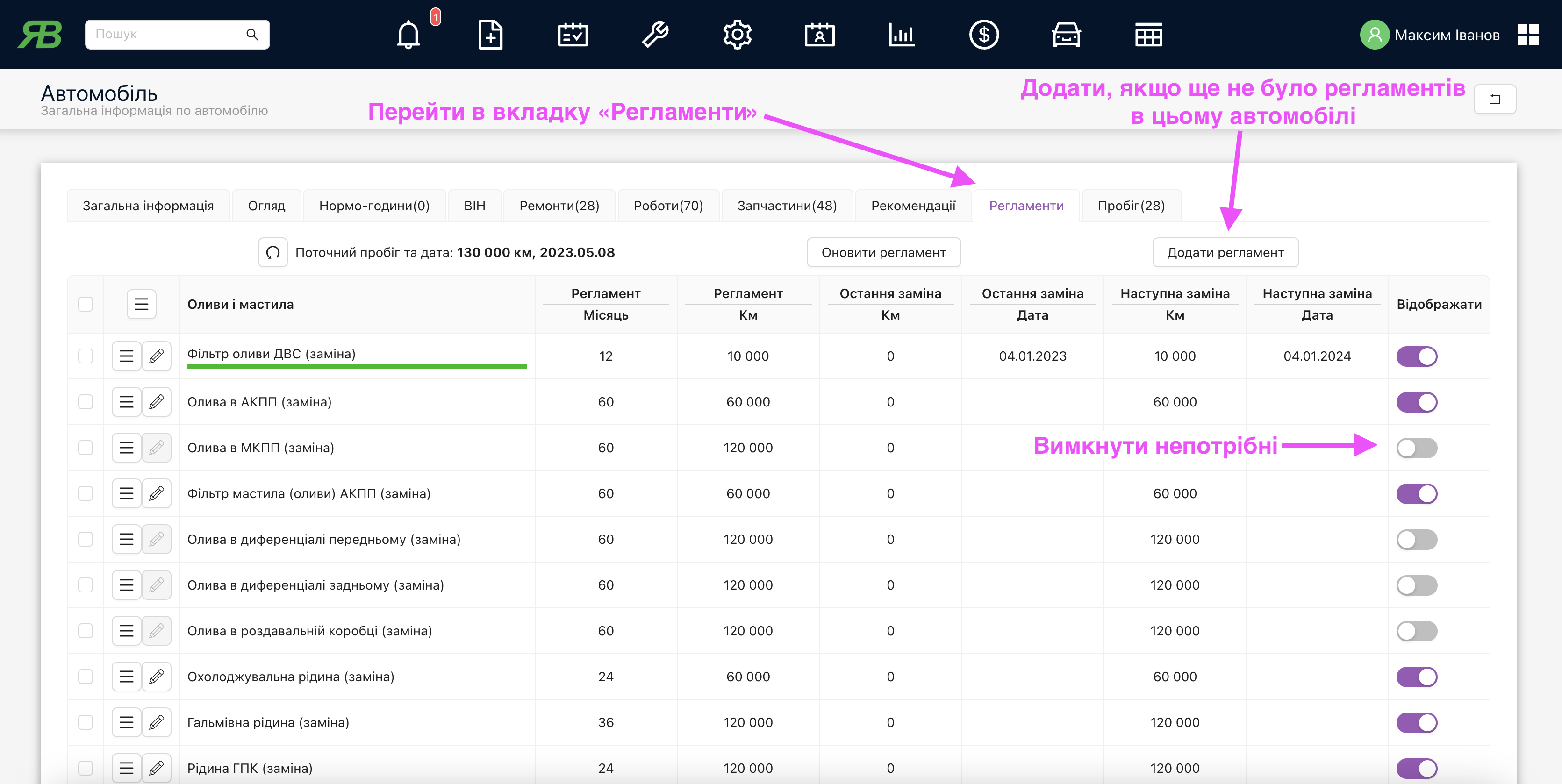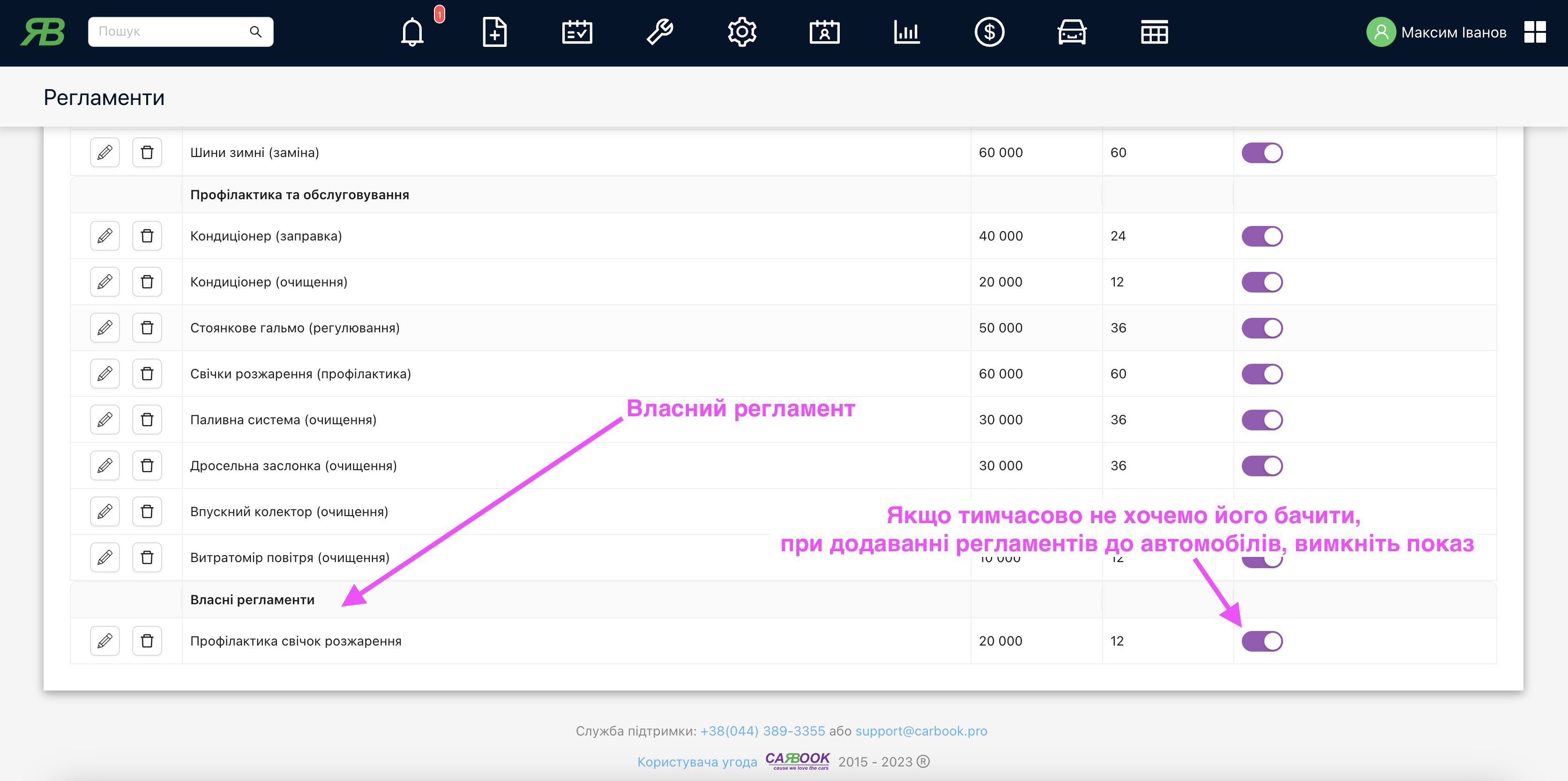 Якщо з якихось причин. ви не хочете бачити певні рядки регламенту при додаванні до автомобілів – вимкніть показ, як вище на фото або видаліть його з системи кнопкою видалення в цьому рядку.