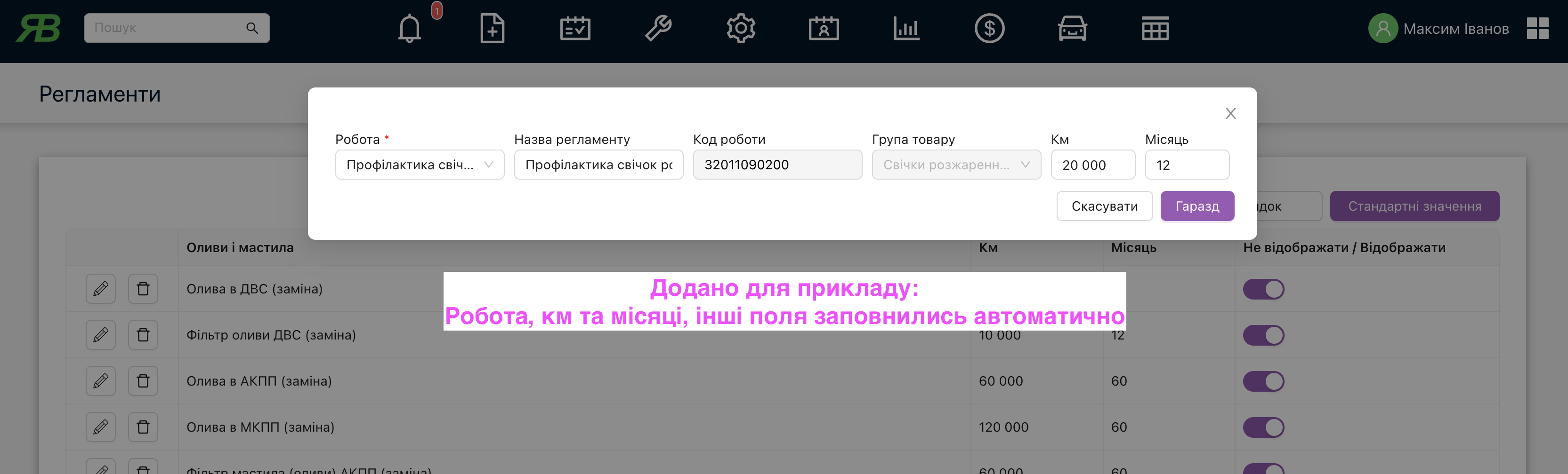 Таким чином, після збереження, ми побачимо свій власний рядок регламенту, який зможемо використовувати при проведенні ремонтів автомобілів.