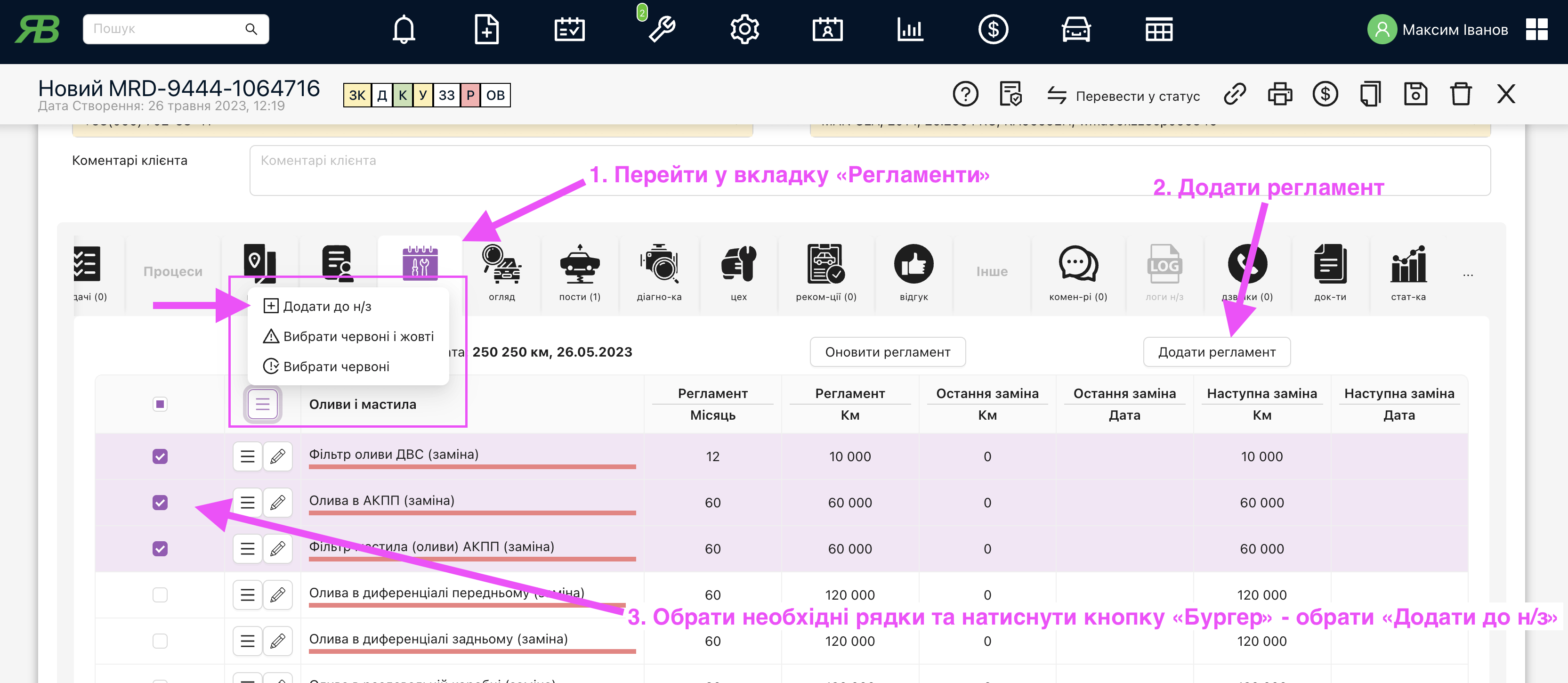 Коли в нас є доданий регламент в наряд-замовленні, і є роботи, які необхідно виконати, ми можемо додати їх у наряд-замовлення та запропонувати клієнту їх виконати, або додати до рекомендацій потім. Отже, перейти у вкладку “Регламент”, якщо не доданий – то додати регламент, через кнопку “Додати регламент”. Далі обрати необхідні рядки та натиснути кнопку “Бургер” де треба вибрати “Додати до н/з”.