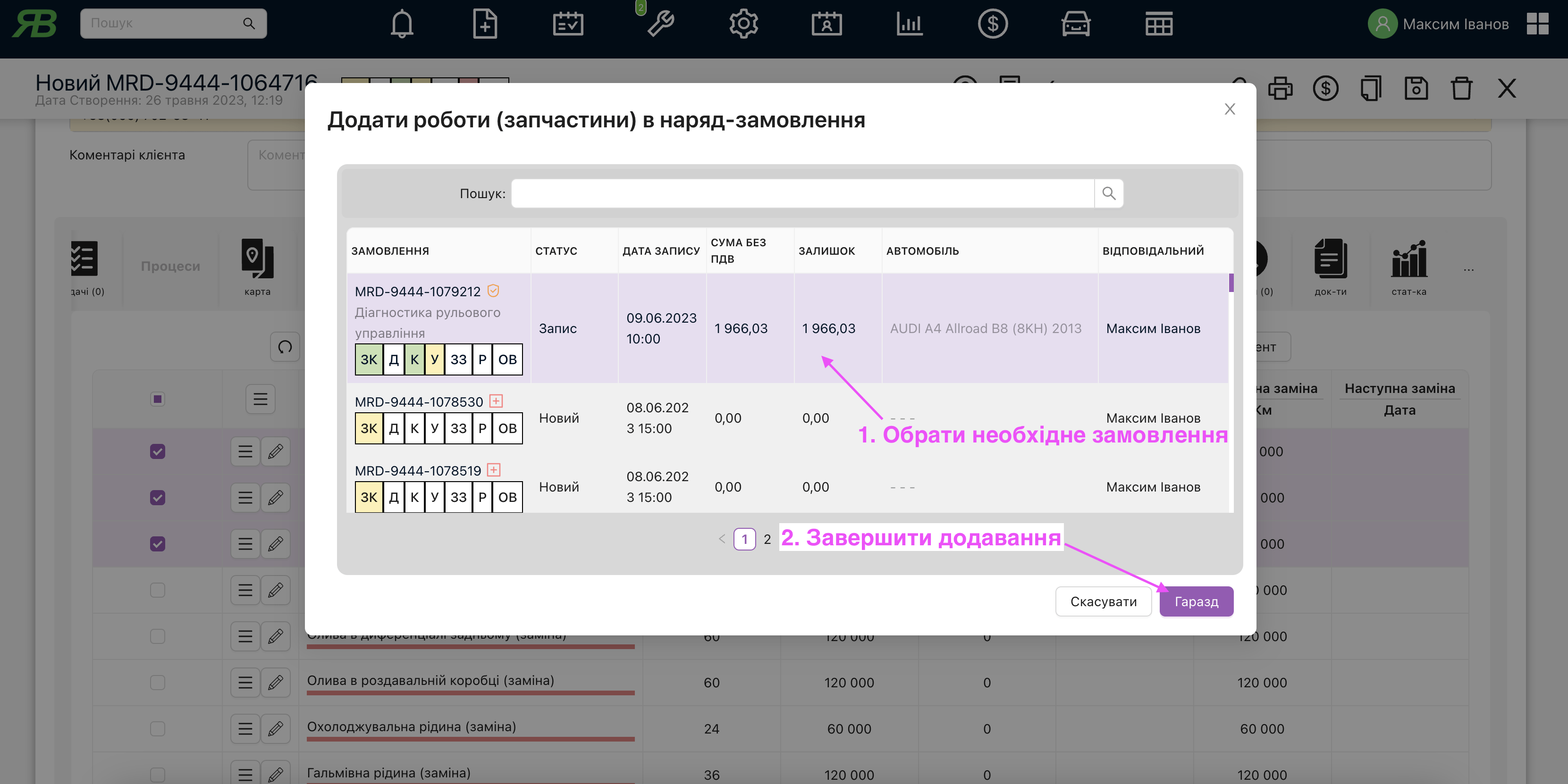 Можемо скористатись кнопкою “Вибрати червоні та жовті” або “Вибрати червоні”, якщо вже раніше працювали з регламентом в цьому автомобілі. Після цієї операції, треба обрати до якого наряд-замовлення додати роботи.