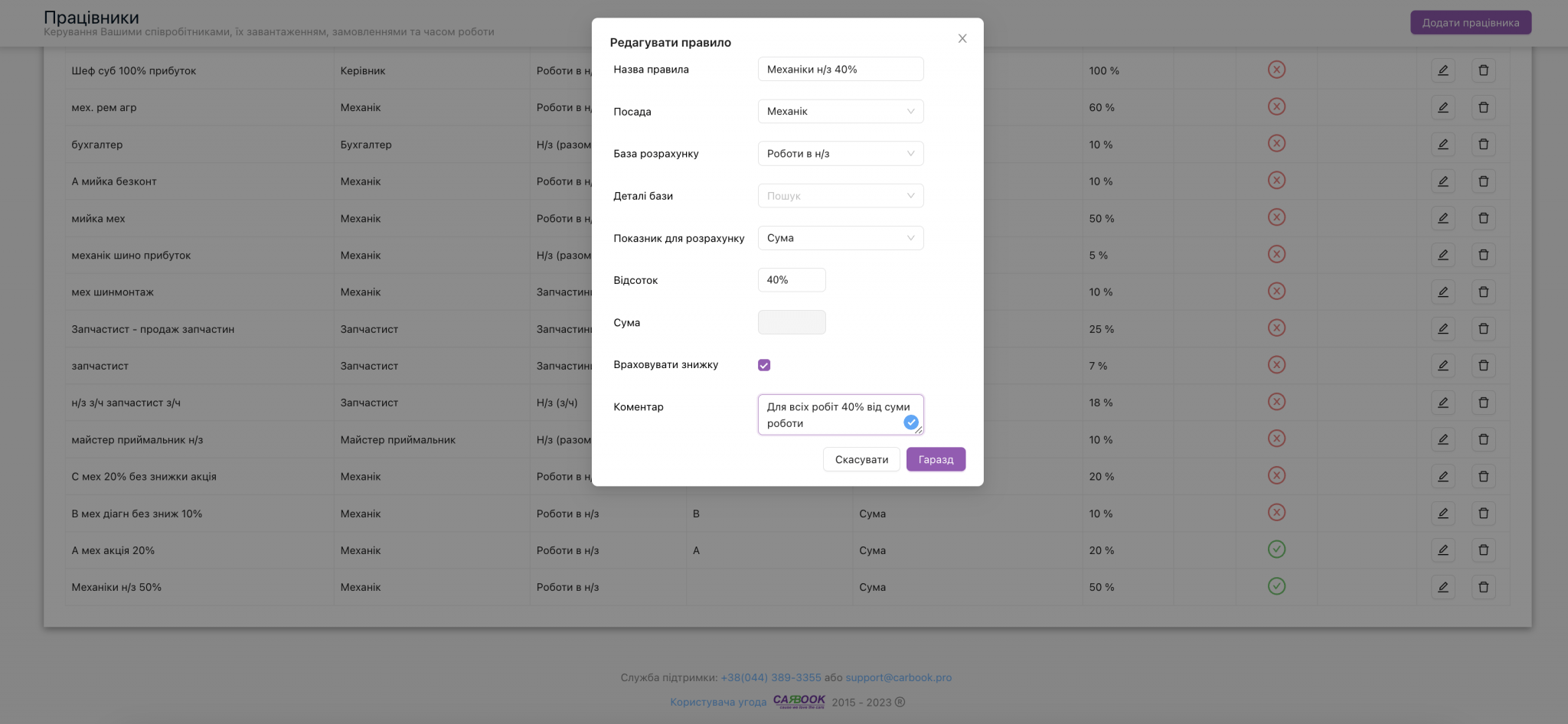 Додавши два правила, натискаємо кнопку “зберегти“. Тепер буде відбуватись нарахування зарплати з усіх робіт, які без правила В – по 40% від суми, а з робіт з правилом В тільки 10% і без врахування знижки.