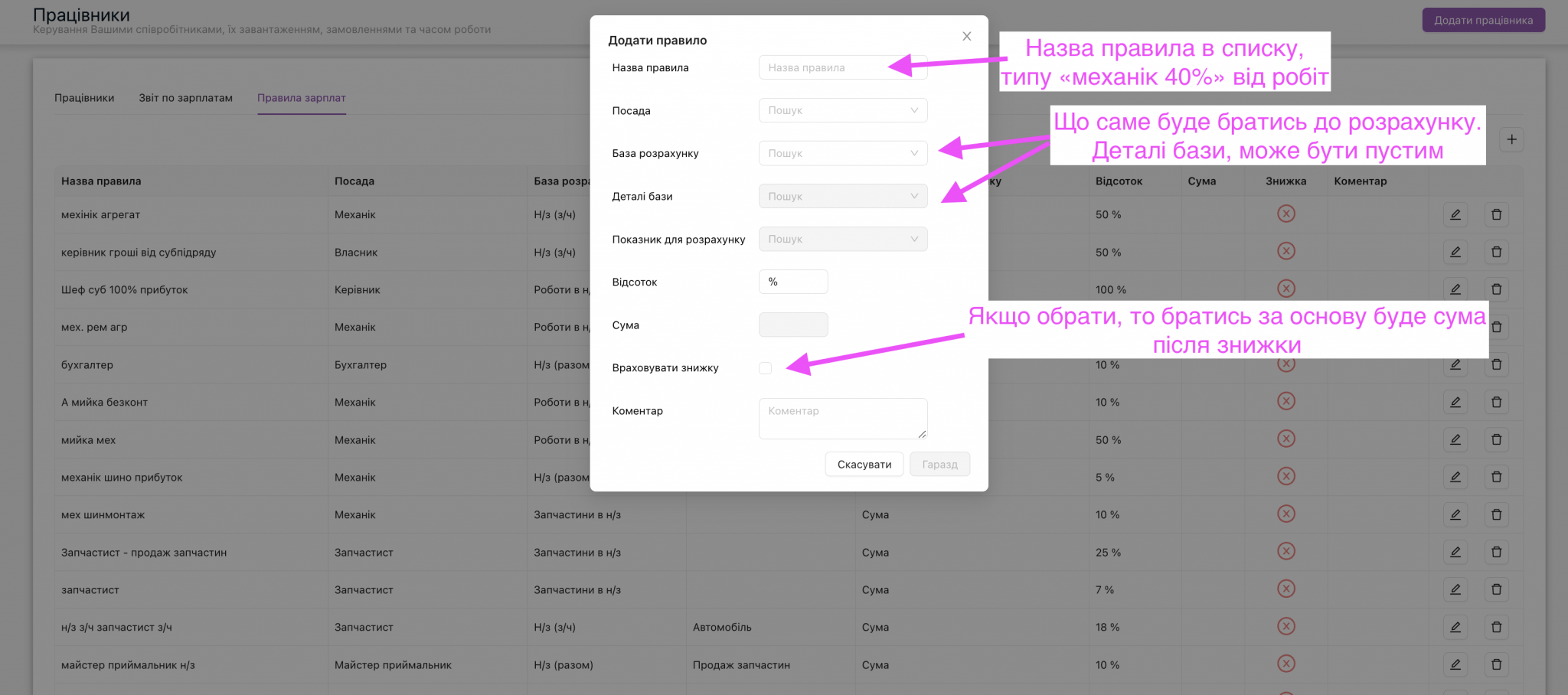 Для “Н/з (разом)”, “Н/з (роботи)”, “Н/з (запчастини)” можна обрати варіанти: автомобіль, продаж запчастин, ремонт агрегата, встановлення ГБО, шиномонтаж, мийка. Далі в залежності від обраної деталі бази обираємо показник для розрахунку – сума, кількість. маржа, прибуток. Таким чином, можемо встановити, яким чином буде відбуватись нарахування. Можна створити декілька правила, один для ремонту автомобіля, інший для встановлення ГБО чи шиномонтажу, і додати до одного працівника.