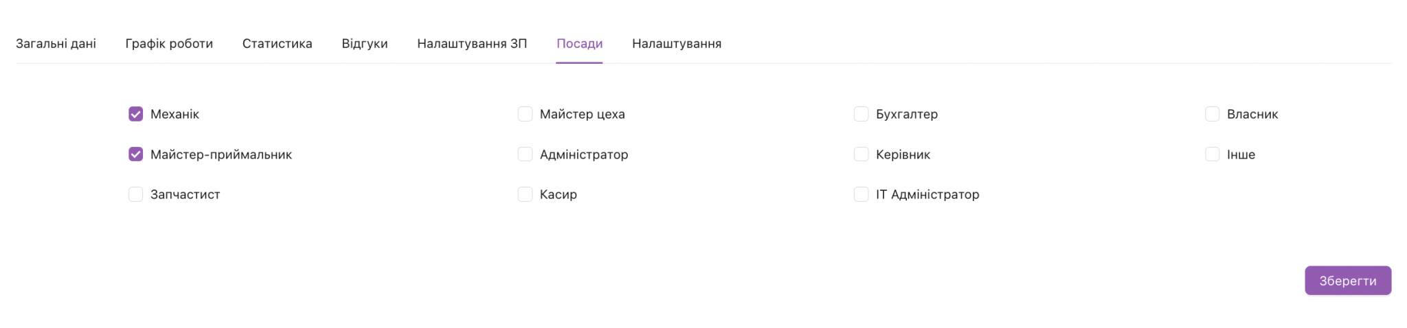 Після того як ми зберегли всю необхідну інформацію, можемо перейти до налаштування зарплати. Зараз ми знаходимось в списку всіх робітників, це список також можна знайти в панель навігації “Довідники та налаштування” – вкладка “Працівники“. Обираємо необхідного, та заходимо в його налаштування, натиснувши на його імені. Переходимо в посади та вмикаємо необхідні.