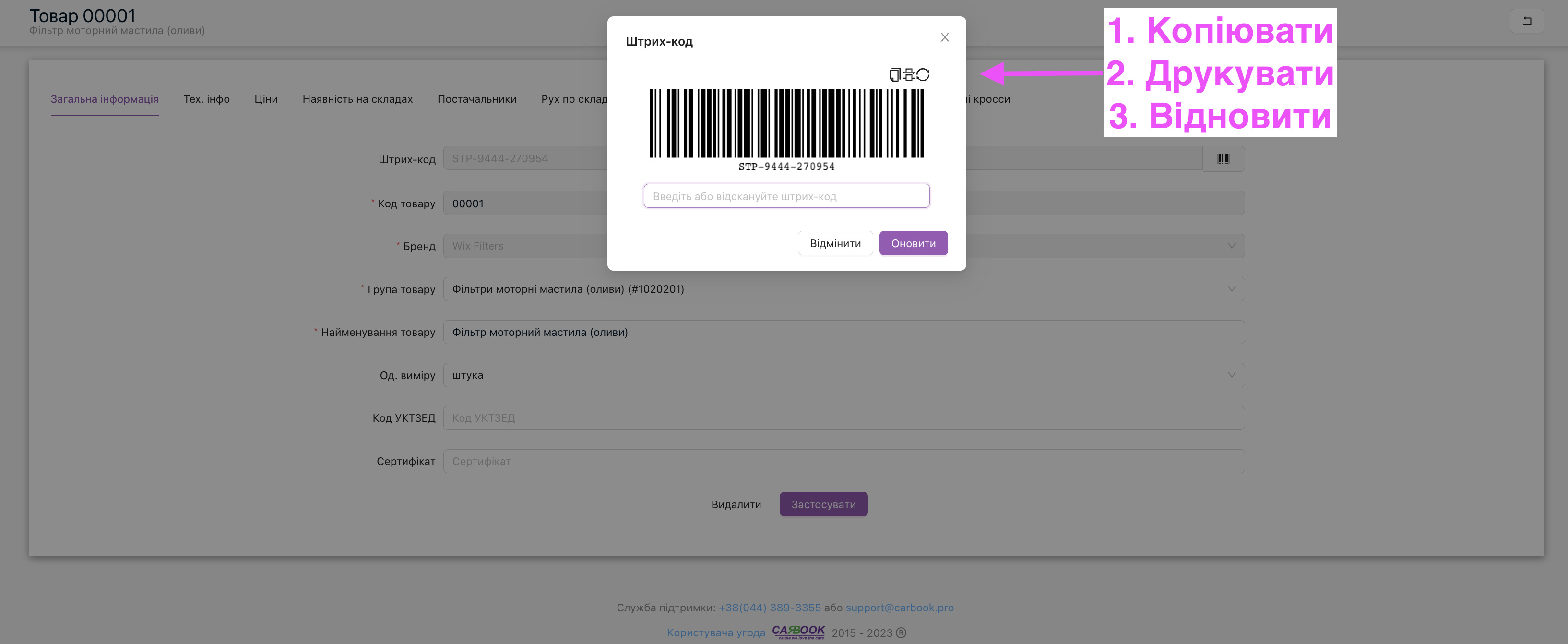 Для цього скануємо товар і натискаємо кнопку “Оновити”, або вписуємо свій код та натискаємо кнопку “Enter”. Для відновлення штрих-коду є іконка поруч з кнопкою друку, після натискання код буде оновлено. Так само й в картці товару, як на малюнках вище.