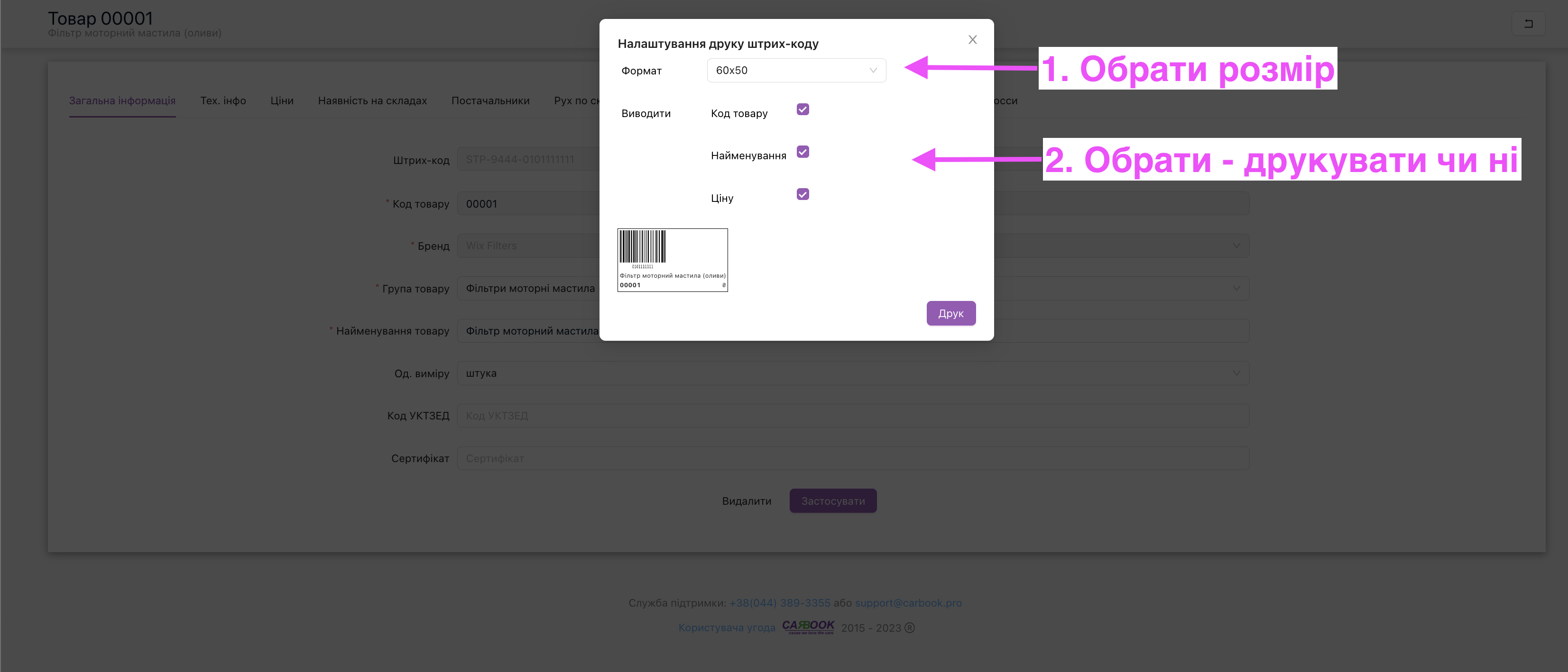 Перший варіант, через “Картку товару“. Коли заходимо в неї, то є можливість натиснути на штрих-код для роботи з ним, далі відкриється вікно, в якому можна або сканувати штрих-код або натиснути кнопку для зміни чи друку.