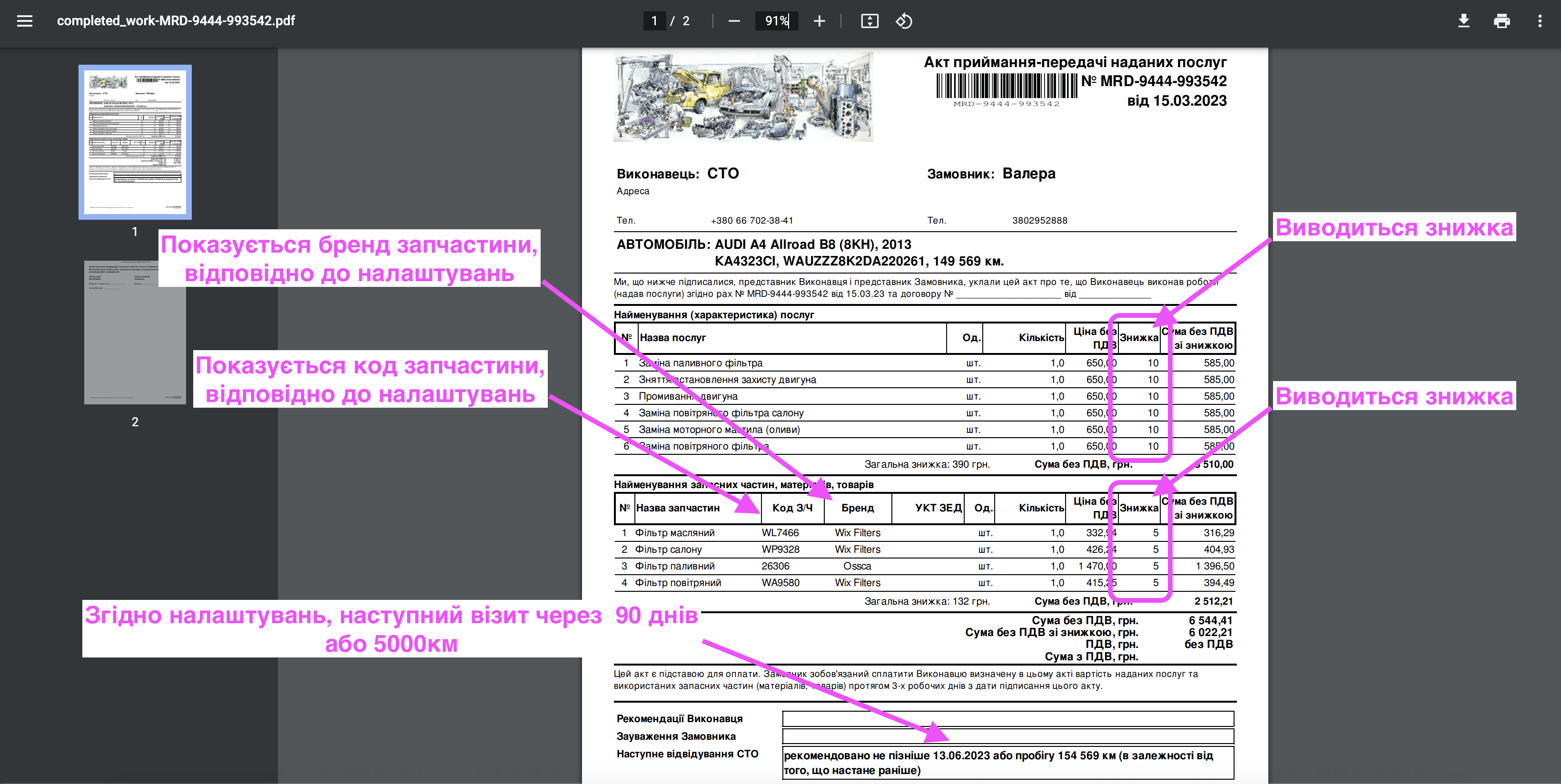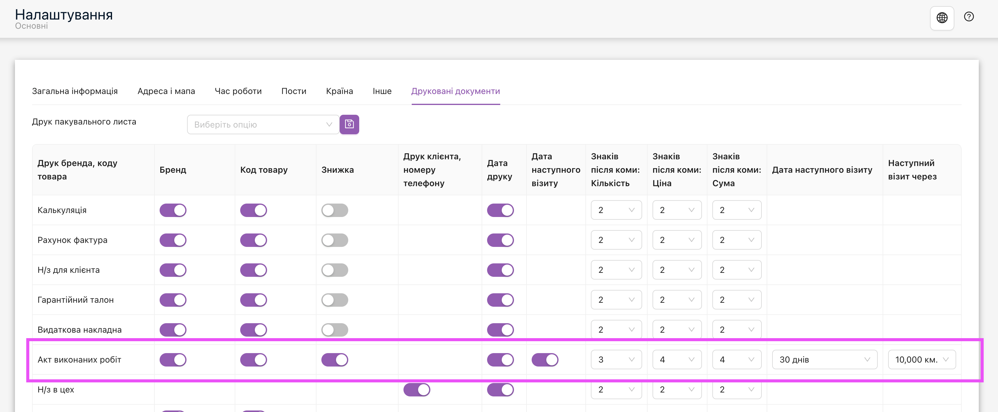 Таким чином, змінюючи налаштування друкованих документів, ми зможемо друкувати документи з необхідною інформацією для клієнтів та працівників станції обслуговування.
