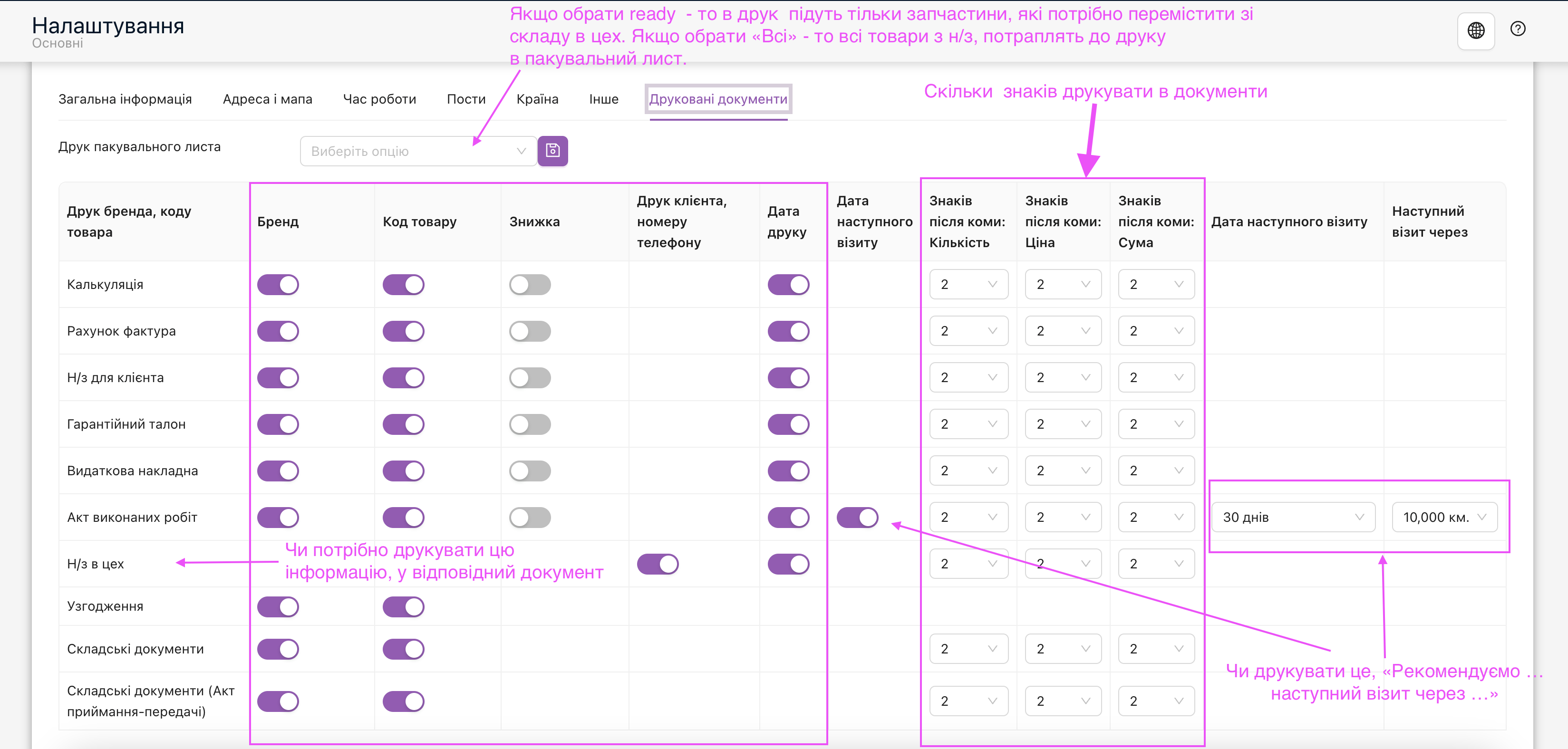 Як налаштувати, що буде видно в друкованих формах документів? Чи показувати код товару в акті виконаних робіт або чи буде видно бренд при узгодженні з клієнтом? Що буде надруковано в наряд-замовленні для цеху та інші налаштування друку документів. Для цього є спеціальний розділ, де можна включити або виключити вивід тієї чи іншої інформації.
