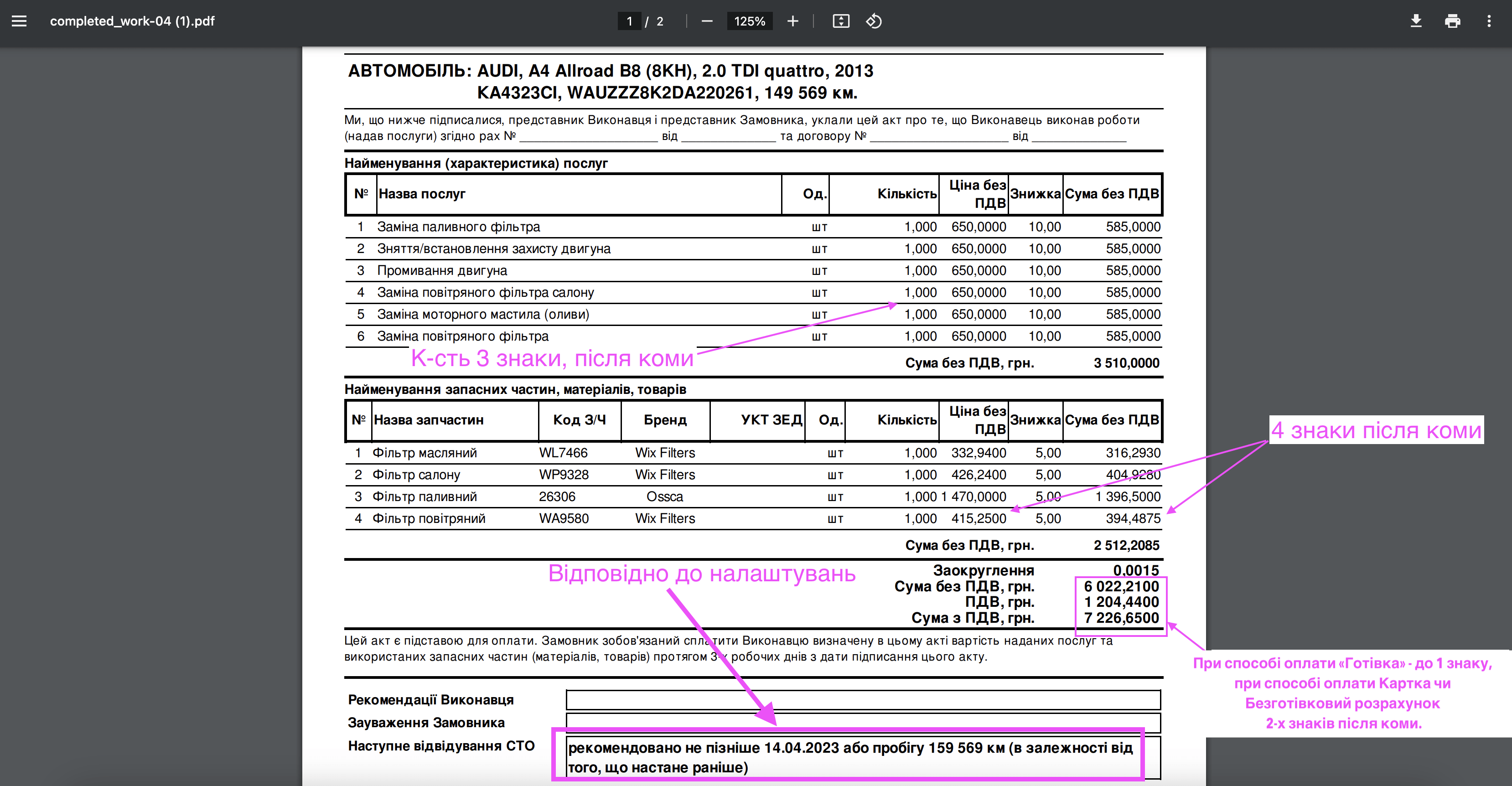 Ось приклад, застосованих налаштувань, в акті виконаних робіт.