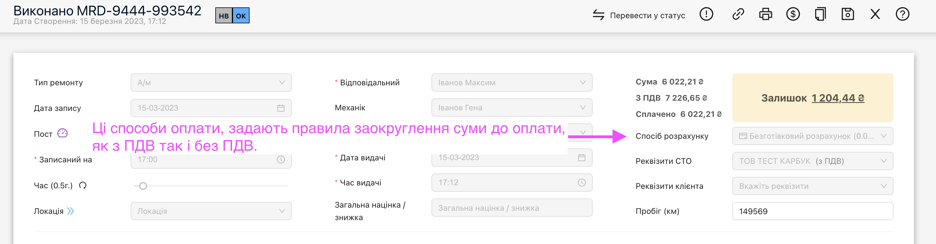 Ось обраний тип оплати в наряд-замовленні.Тип заокруглення суми задається способом розрахунку обраним в н/з - або 0,01 безготівковому чи картою або 0,1 при готівковому.