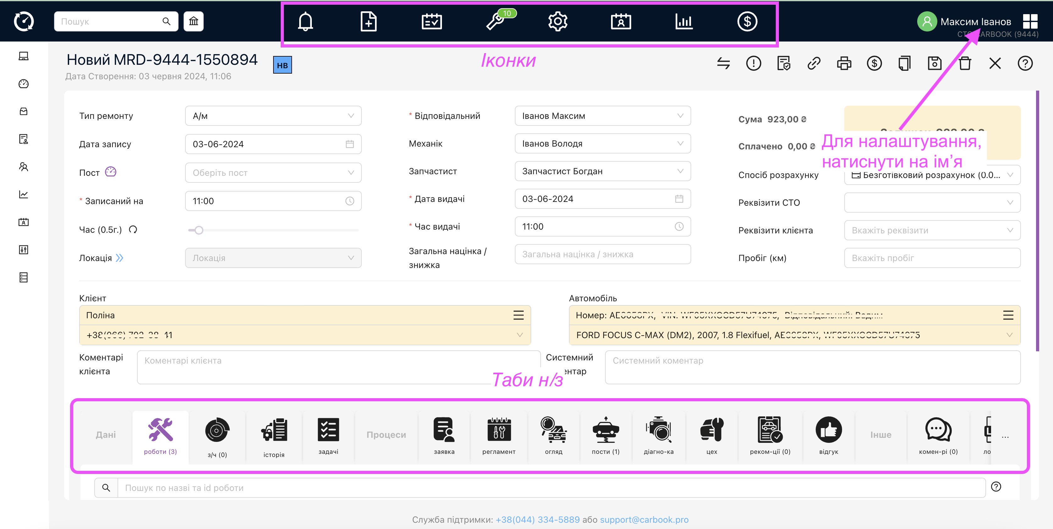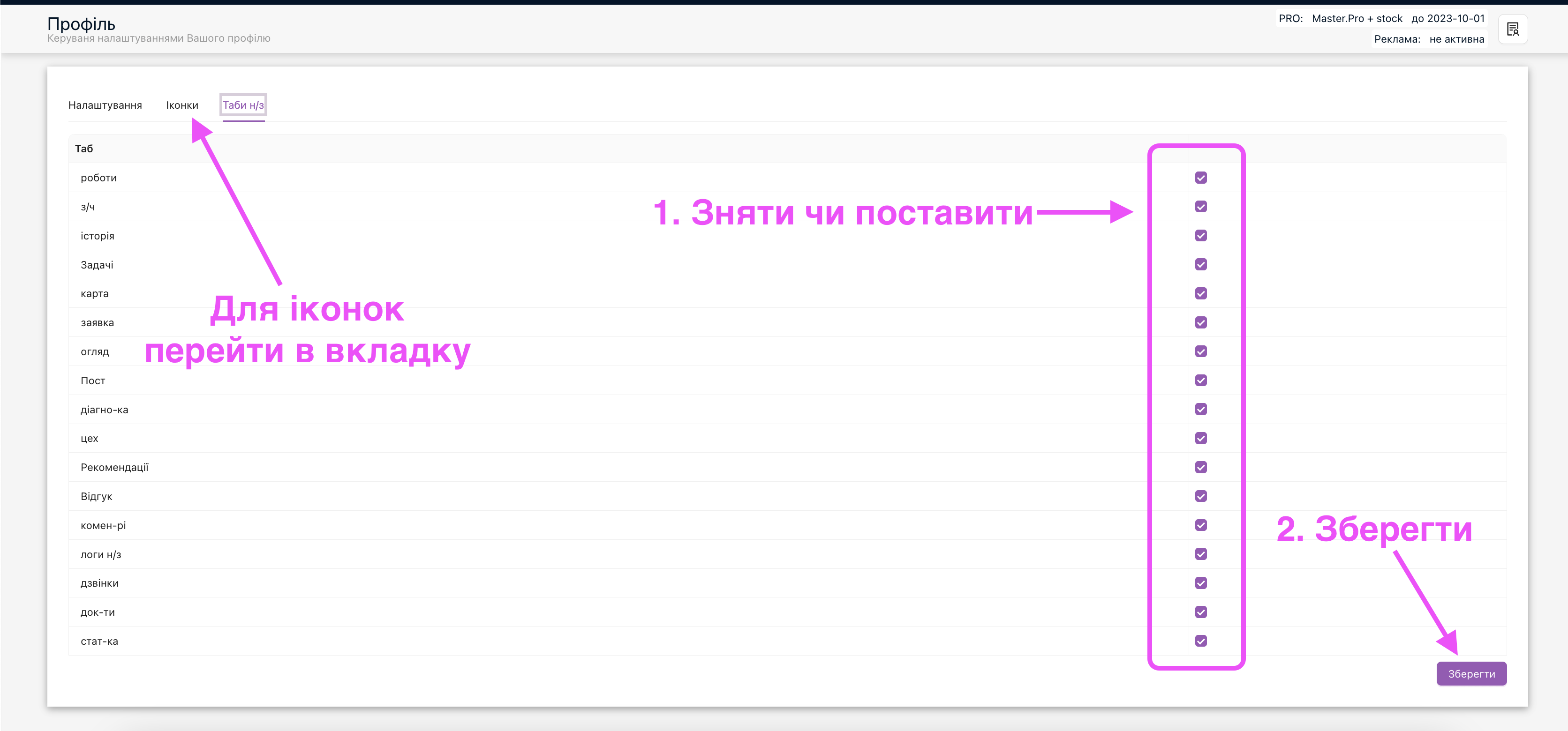 Як налаштувати, які вкладки будуть показуватись в наряд-замовленні? Як прибрати вкладки, якими не користуєтесь? Для цього натисніть на назву свого користувача та у відповідних розділах поставте або зніміть відмітку, таким чином будуть додані іконки чи таби н/з.
