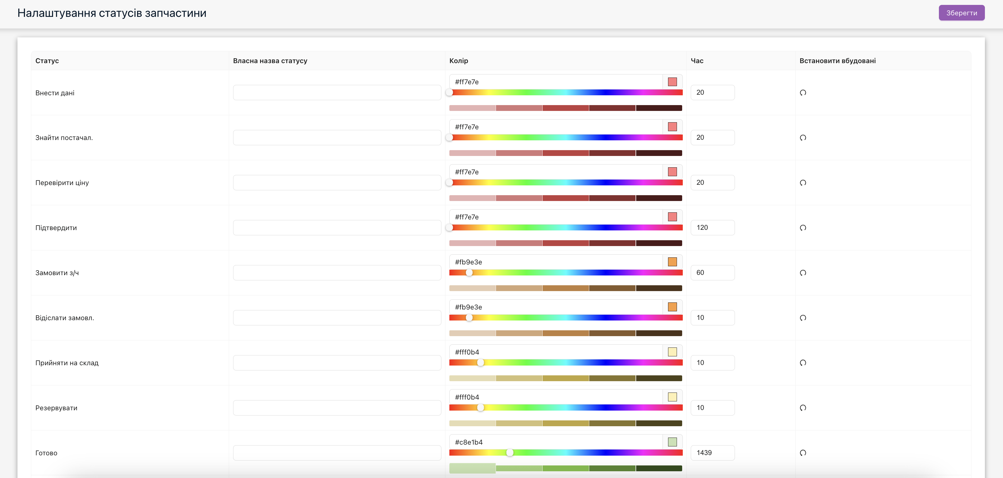 При роботі з запчастинами в наряд-замовленні, є кольорове позначення статусів роботи з запчастинами. Для налаштувань треба перейти в розділ “Довідники та Налаштування”, потім обрати розділ “Статуси”. Після внесення необхідних кольорів або змінення назви статусу треба натиснути вгорі кнопку “Зберегти“.