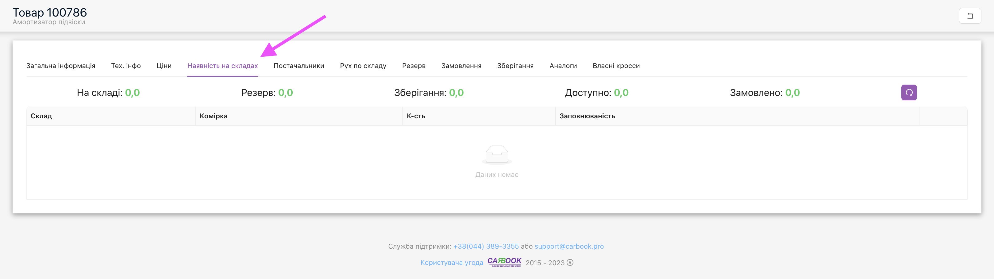 Клацнувши в рядку товару на код, зможемо перейти в середину картки товару та перейдемо в вкладу “Наявність товару”.