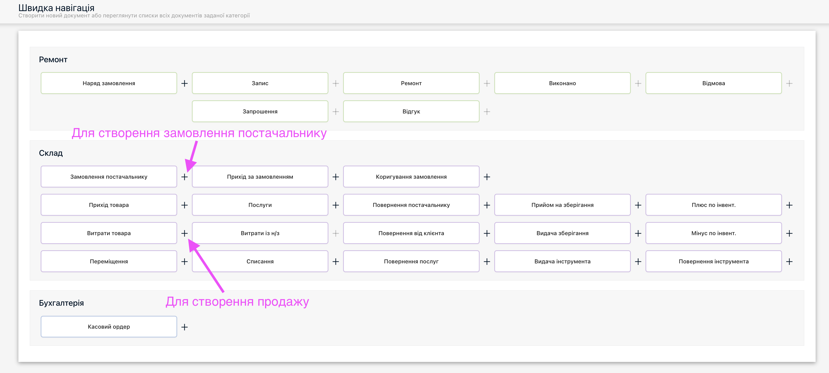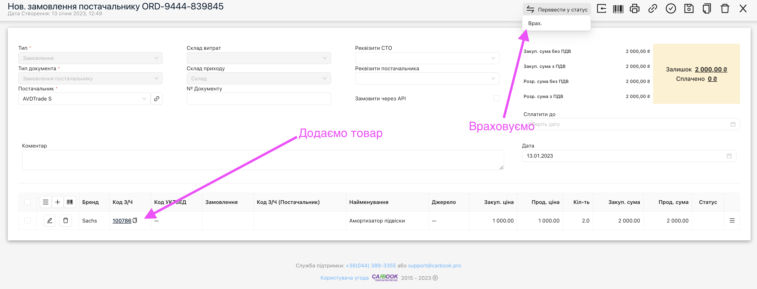 Робимо замовлення “ORD” та робимо прихід за замовленням “INK”, (Для цього в створеному замовленні постачальнику, після врахування, натиснемо праворуч кнопку копіювання, та оберемо “створити прихід”, після чого його теж врахуємо), таким чином товар зʼявиться у нас на складі.
