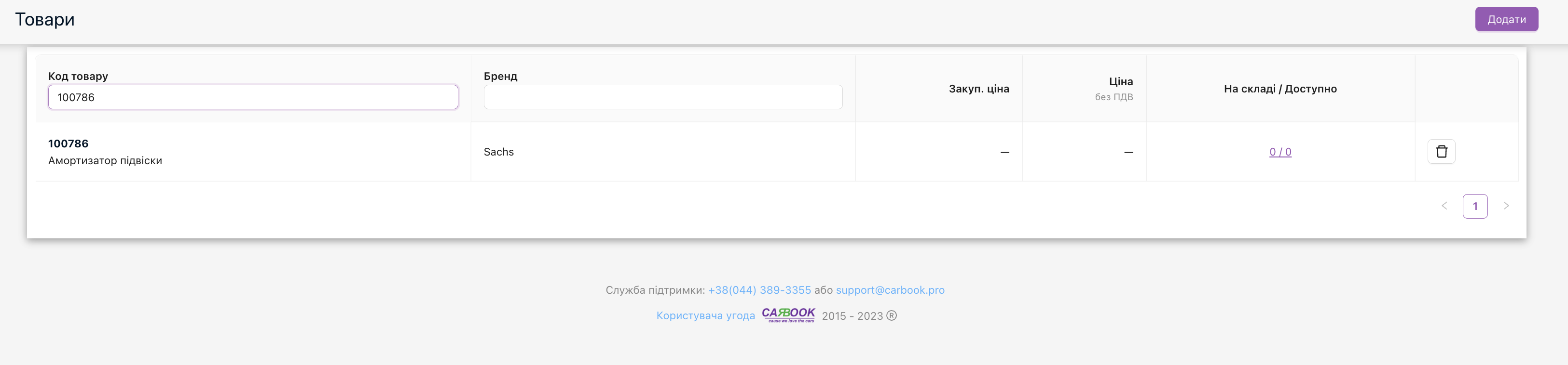 Для розуміння, як це працює, розглянемо приклад товару “Амортизатор передній Sachs 100786”. Спочатку додамо його в товари Довідник та налаштування”“Товари” –  кнопка “Додати” та заповнюємо доступні нам поля. Після цього заходимо в картку цього товару, клацнувши на ньому в переліку товарів. І відразу бачимо, що в наявності товару немає.