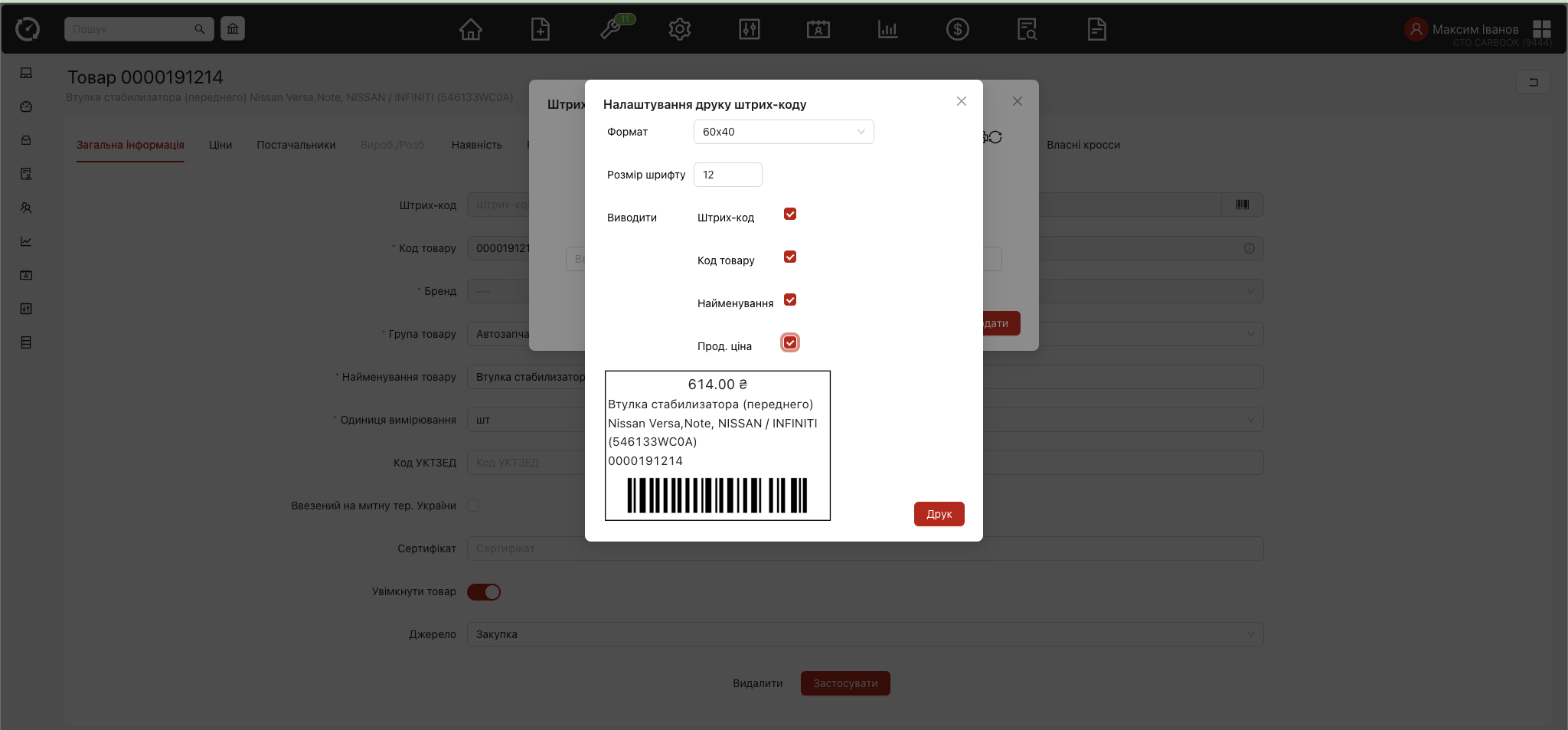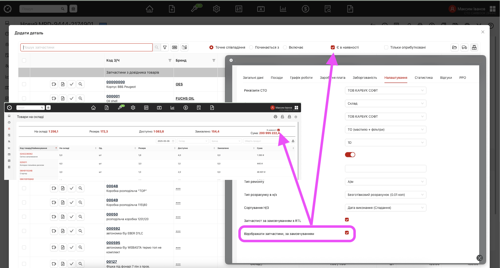 - Картка працівника — таб “Налаштування” – додано чекбокс “В наявності” для налаштування індивідуально для кожного користувача. Значення використовується у вікнах “Підбір запчастин” та “Каталог” та “Товари на складі”.