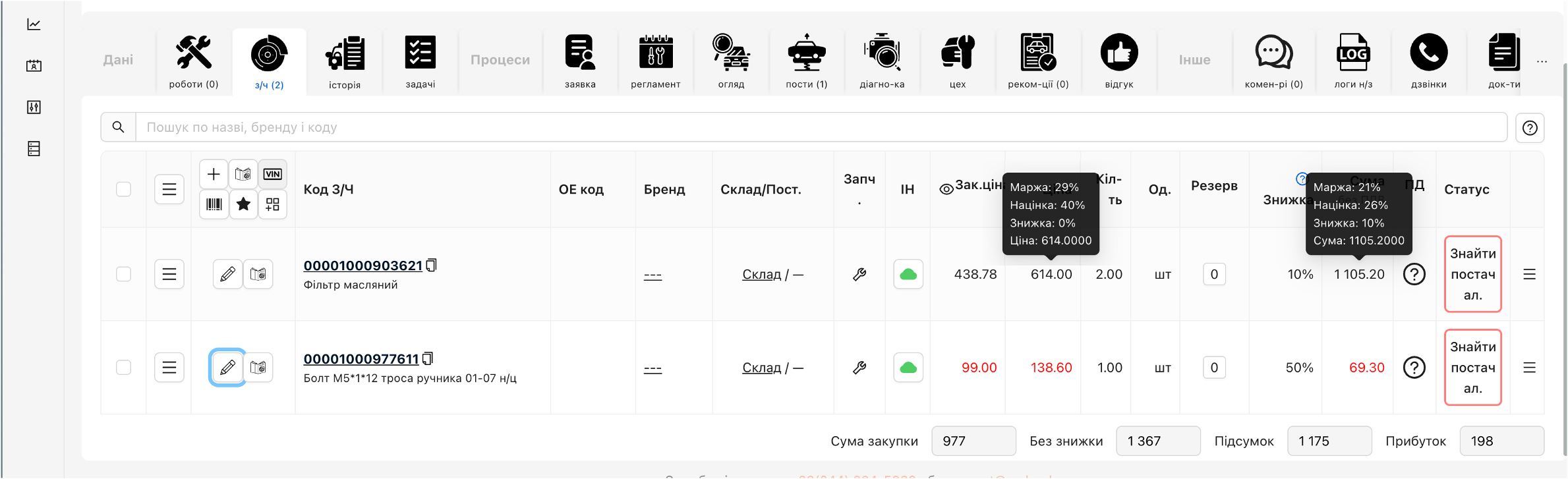 ▪️Tooltip у наряд-замовленні — таб “Запчастини”
