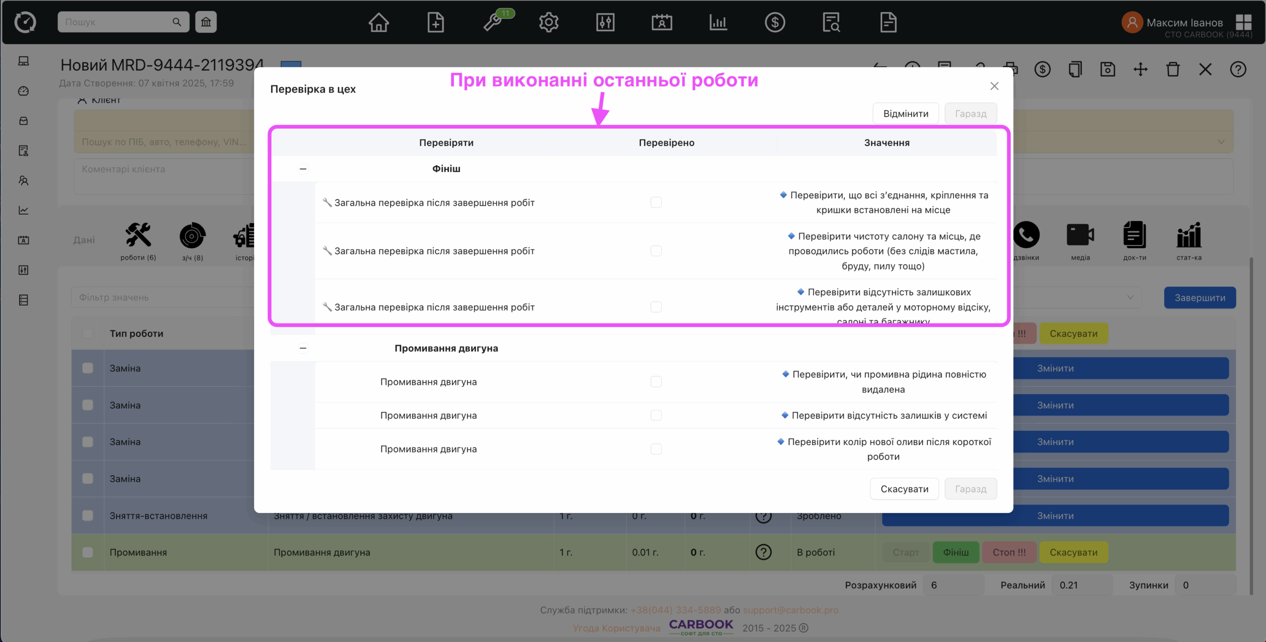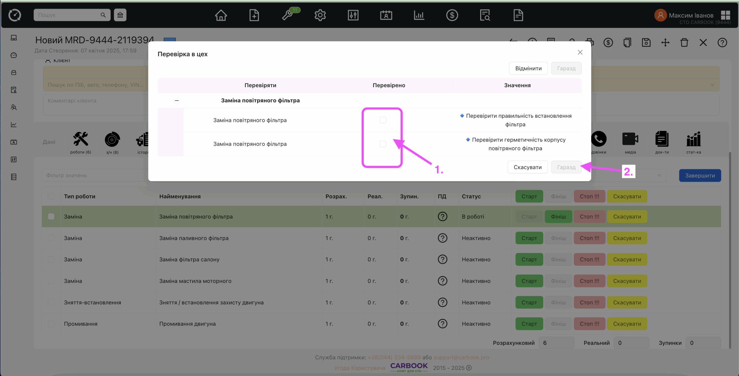 - Взаємодія з роботами в табі «Цех» в н/з можливо тільки вказаним механіком у рядку роботи, МП чи майстром цеху. Потрібно натиснути чекбокси “Перевірено” і тоді буде доступна кнопка “Гаразд”, після натискання якої, робота отримає статус “Зроблено”.