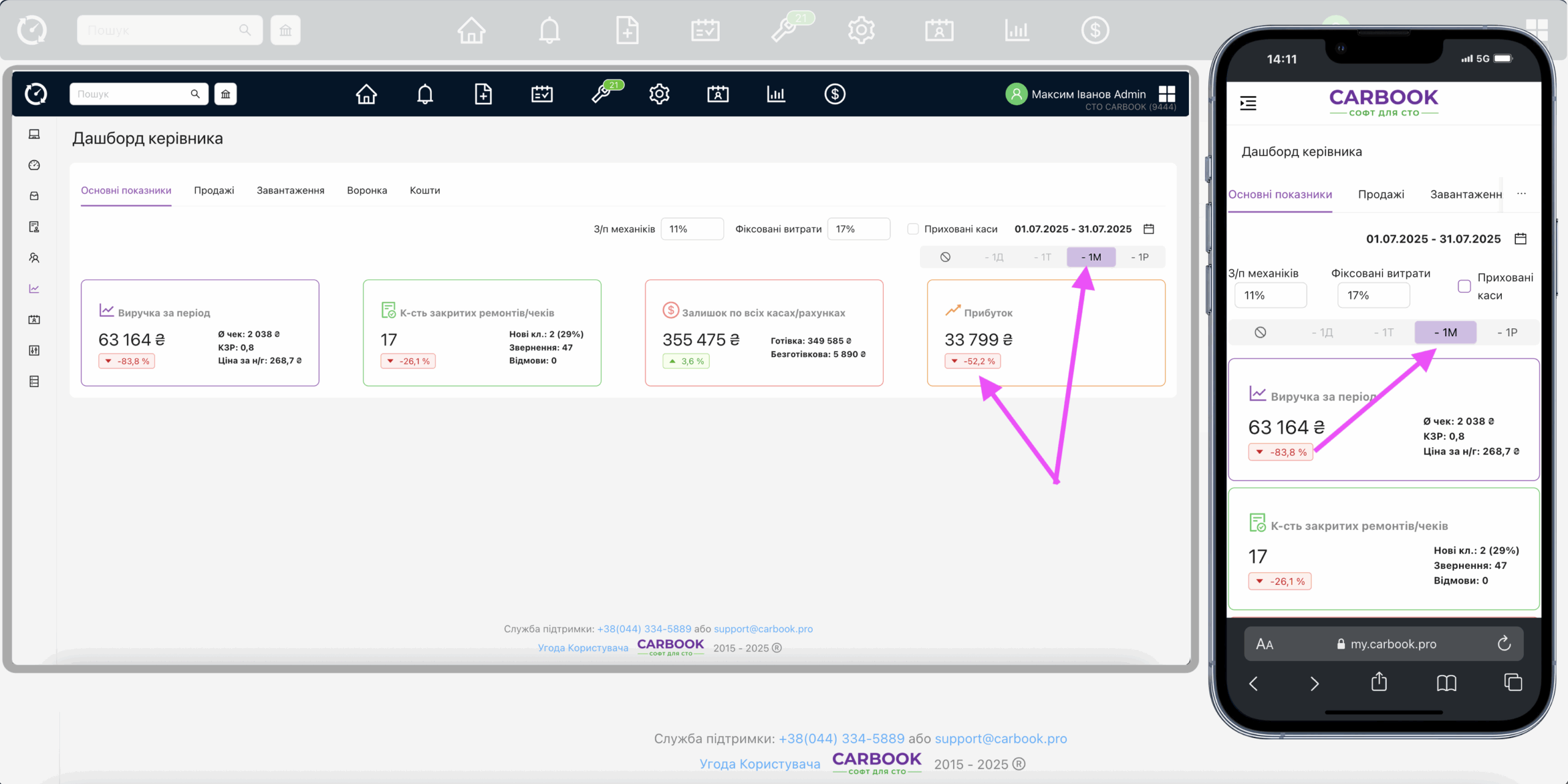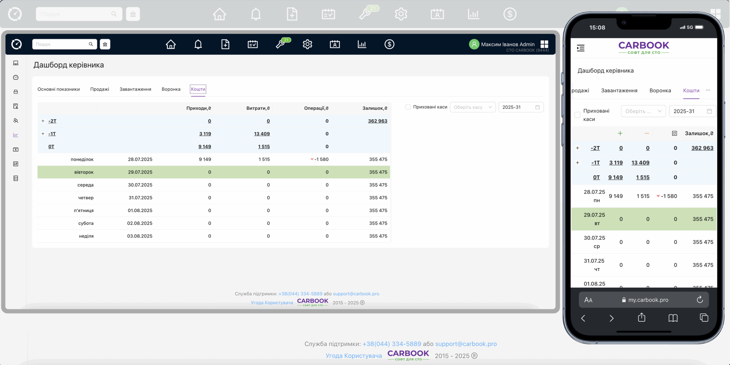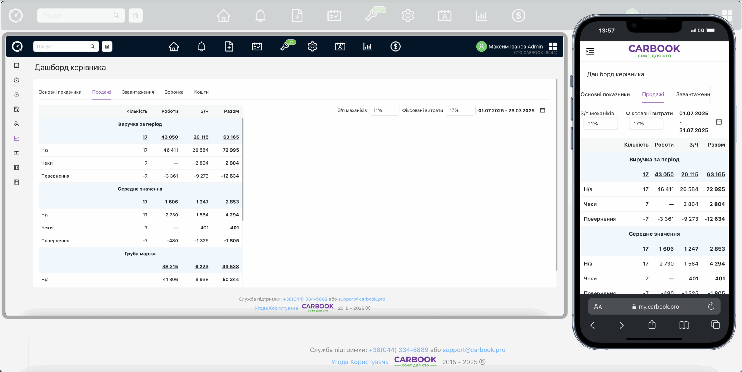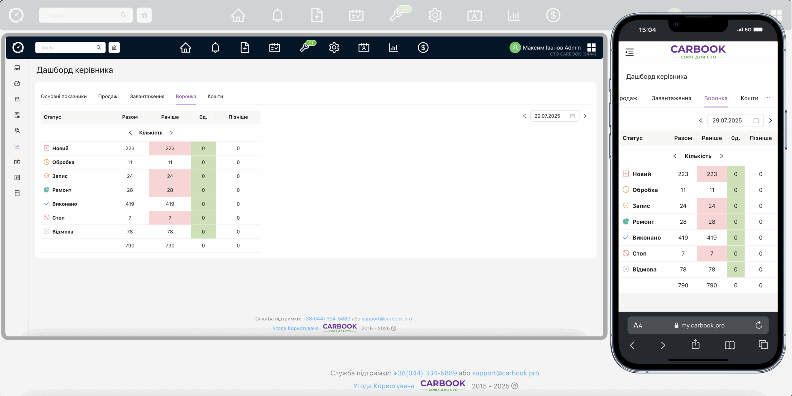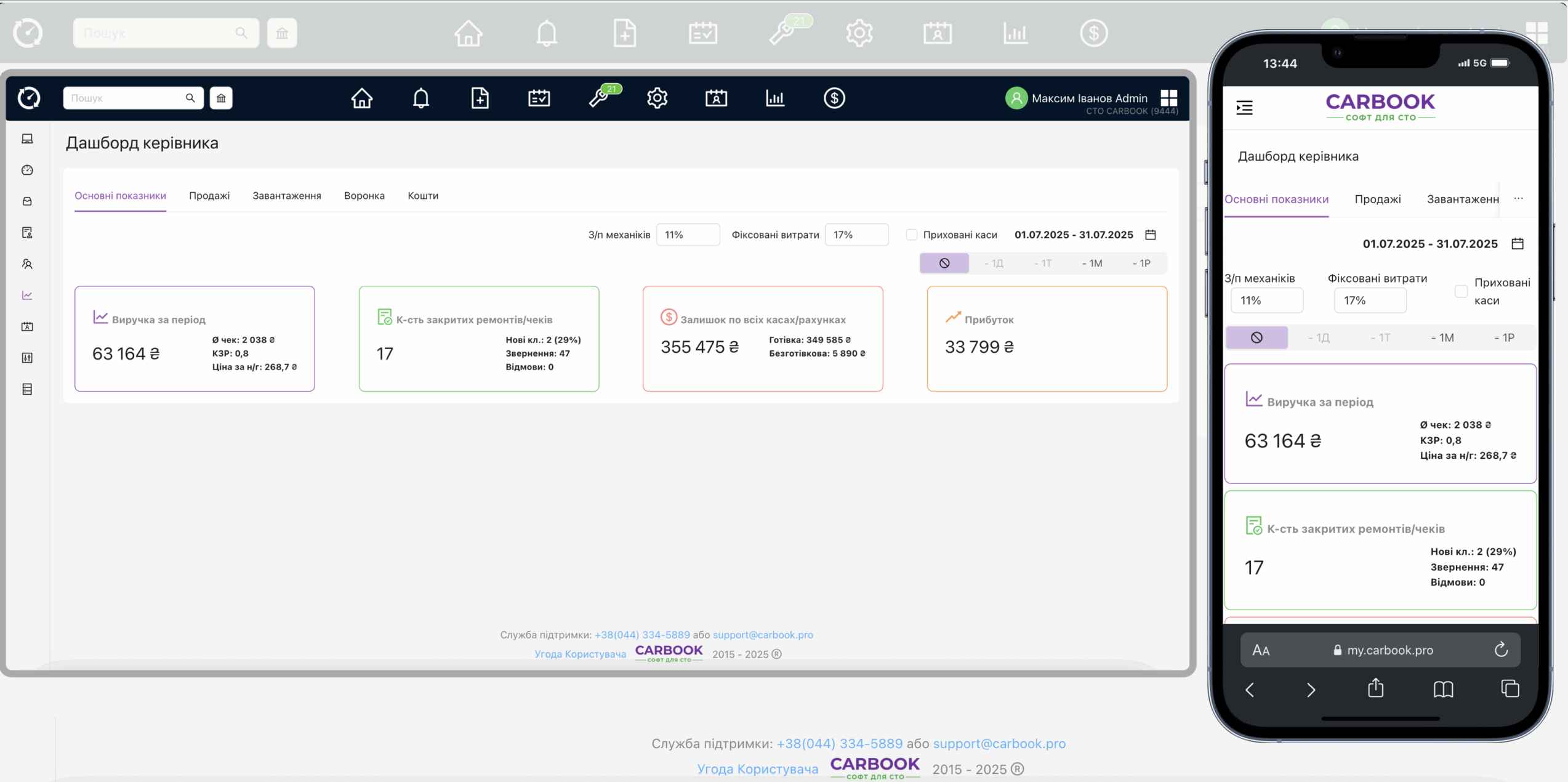 - Дашборд керівника — потужний інструмент для аналізу ключових бізнес-метрик вашої СТО. Цей адаптивний інтерфейс працює як на комп’ютерах, так і на мобільних пристроях, забезпечуючи зручний доступ до даних у будь-який час. Дашборд складається з п’яти вкладок, кожна з яких надає детальну інформацію для ефективного управління.