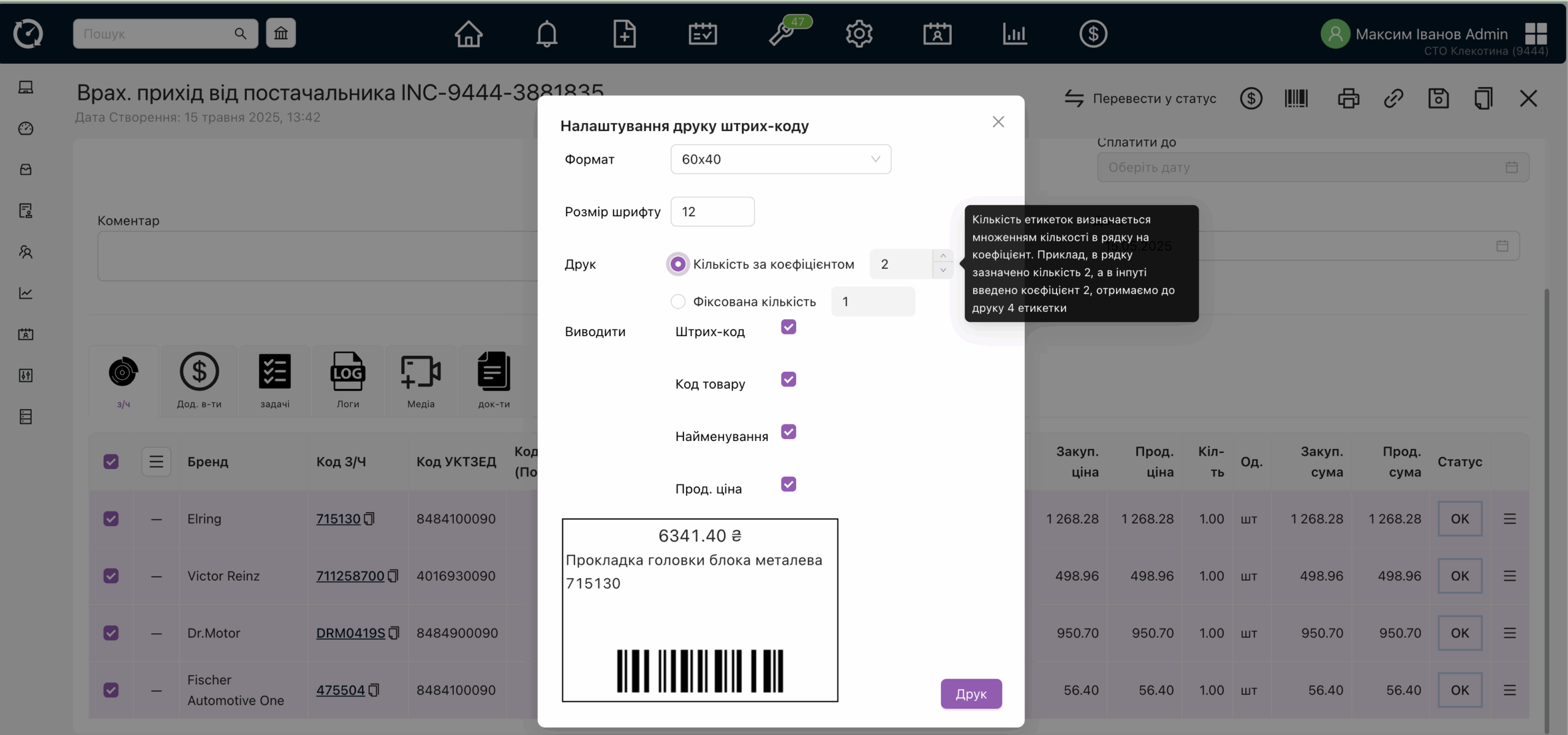- Додано два варіанти вибору кількості етикеток: “Кількість за коефіцієнтом” – “Кількість етикеток визначається множенням кількості в рядку на коефіцієнт. Приклад, в рядку зазначено кількість 2, а в інпуті введено коефіцієнт 2, отримаємо до друку 4 етикетки”. Другий варіант “Фіксована кількість” – “До кожного рядка буде надруковано однакову кількість етикеток — згідно з коефіцієнтом. Наприклад: при значенні 2 — по 2 етикетки на кожен рядок.”. За замовчуванням, активний “Кількість за коефіцієнтом” (Числа тільки цілі, без ком і знаків після коми).