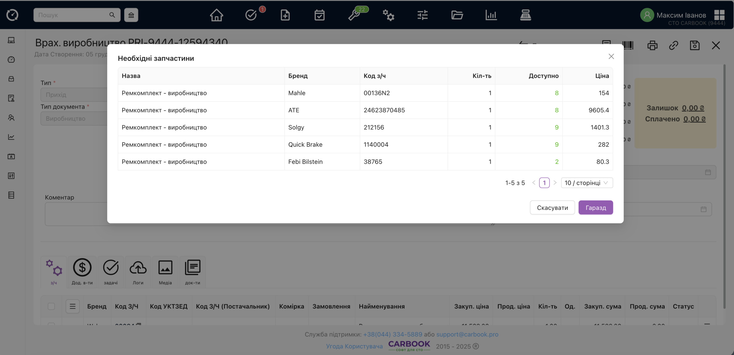 - В модальному вікні “додавання роботи” – відображається перелік з/ч, які будуть додані та скоригувати перелік.