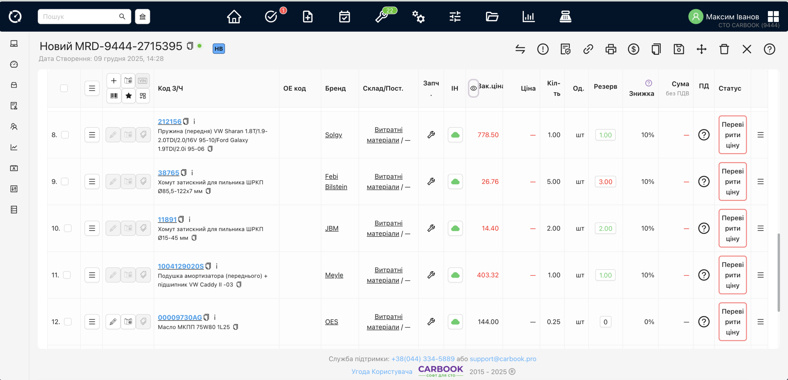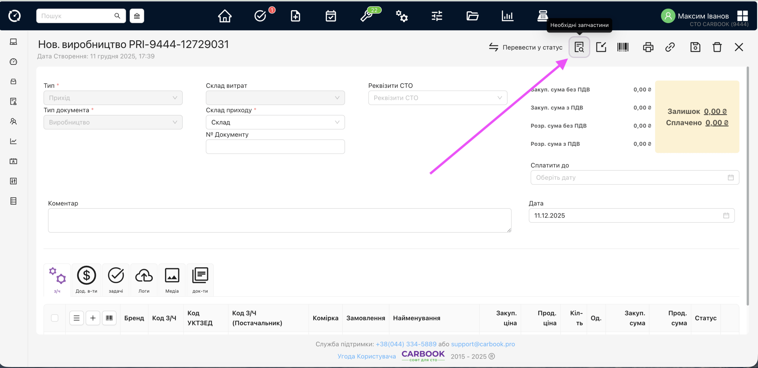 - У кожну роботу можна додати витратні матеріали з каталогу, вказавши кількість та тип запчастини: «запчастина СТО», «витратні матеріали» або «запчастина клієнта».