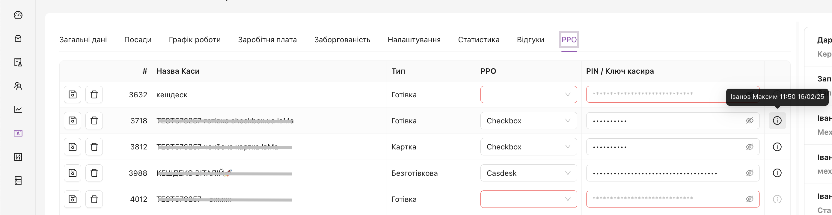 - В табі РРО — відображені всі каси РРО та поля вибору постачальника послуг checkbox.ua чи cashdesk.ua і ключ чи пін-код до відповідної каси. Також додана іконка, з виведенням інформації про відповідального за останню дію в налаштуванні.