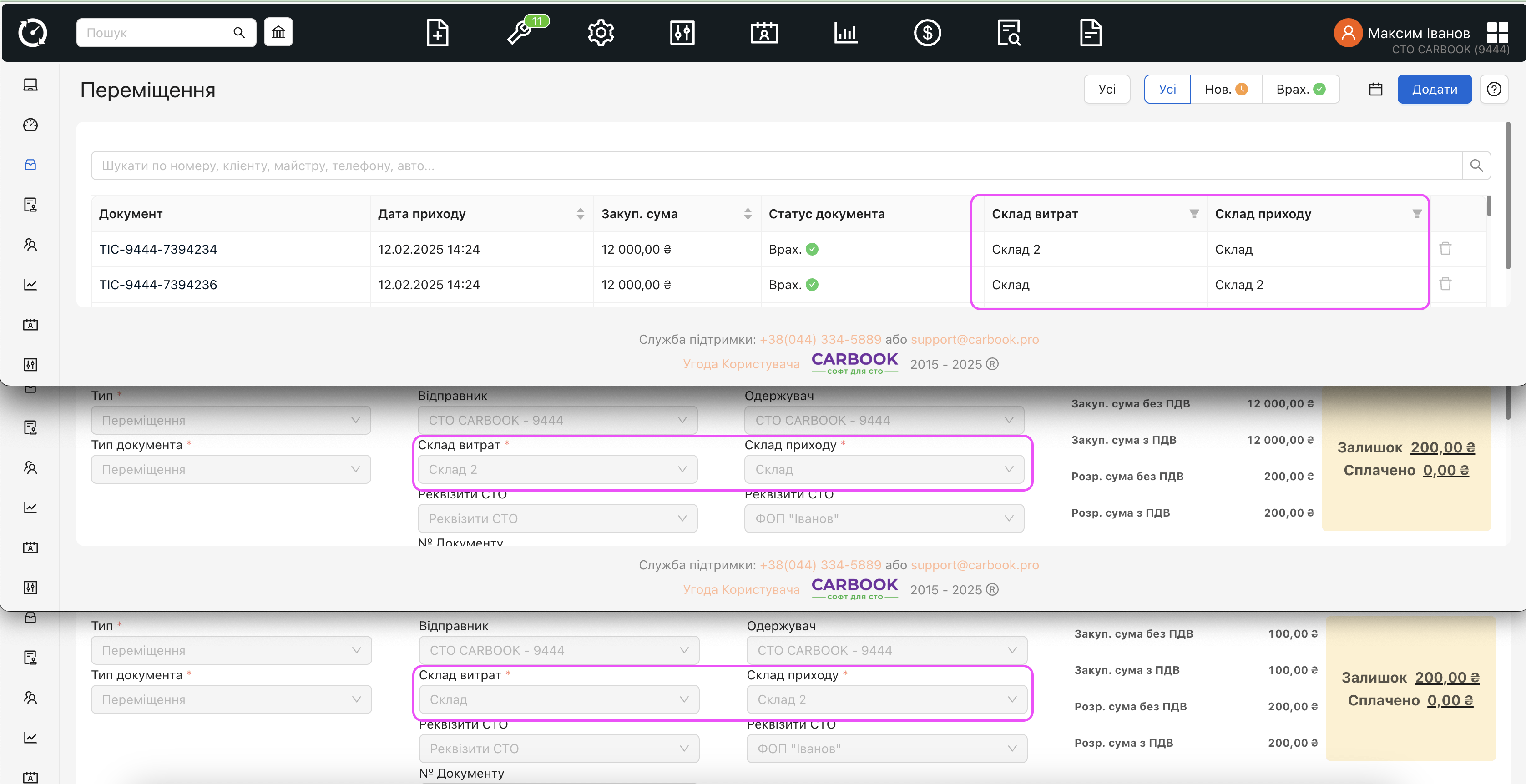 • Для документів TSF підписані склади відповідно до призначення: “склад витрат” та “склад приходу” у відповідних типах документів.