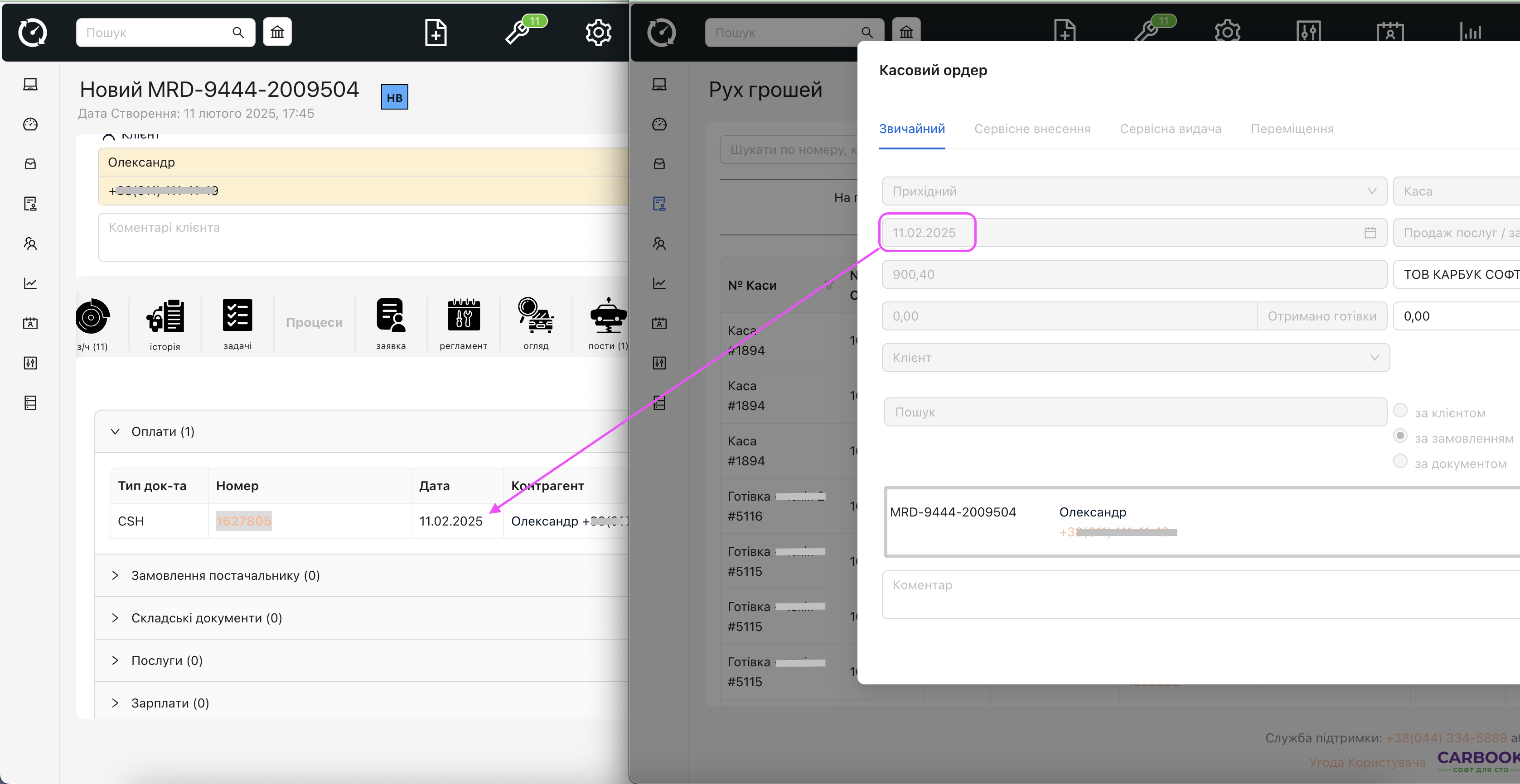 • В документа н/з, СД, SAL в табі “документи” в розділі “Оплати” – виводяться csh по даті в самого документа.Вивід документів CSH в табі документи в н/з, по даті документа в СД, SAL.